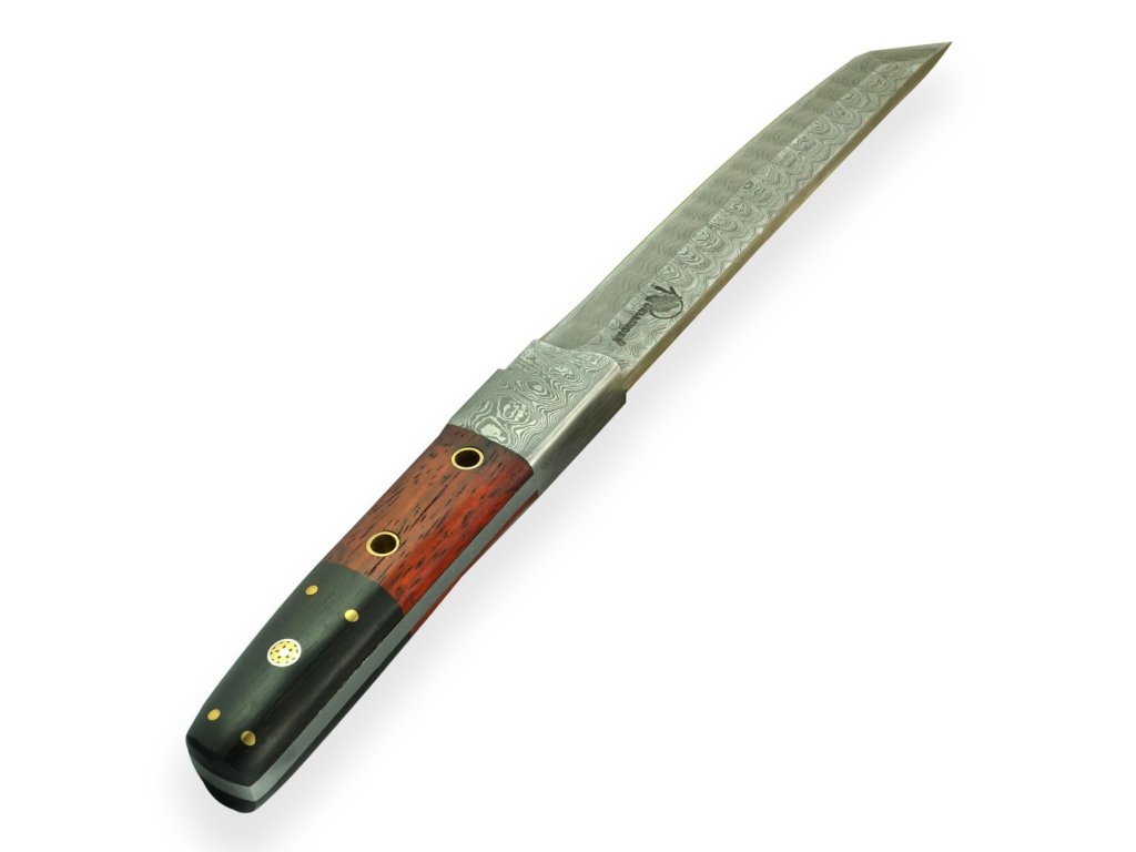 Rukojeť: Rukojeť je vyrobena z kombinace dřev Padauk a Ebony. Padauk je známé svou pevností a atraktivní oranžově červenou barvou, zatímco Ebony je tvrdé a tmavé dřevo, což poskytuje nůži elegantní vzhled a stabilitu.