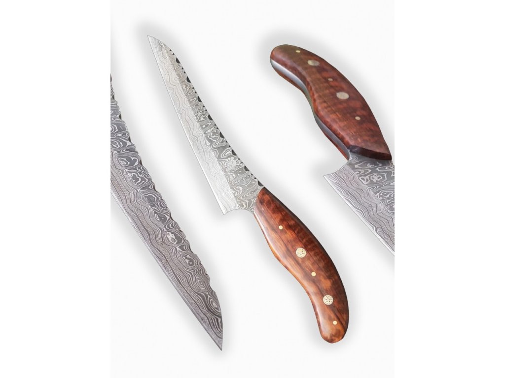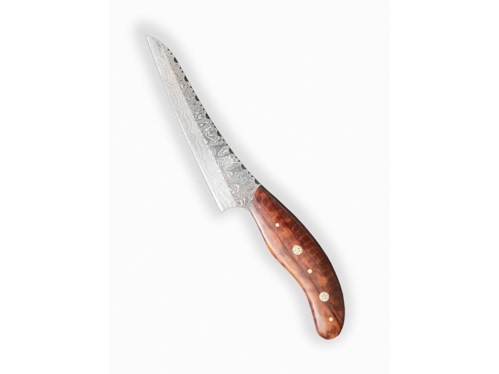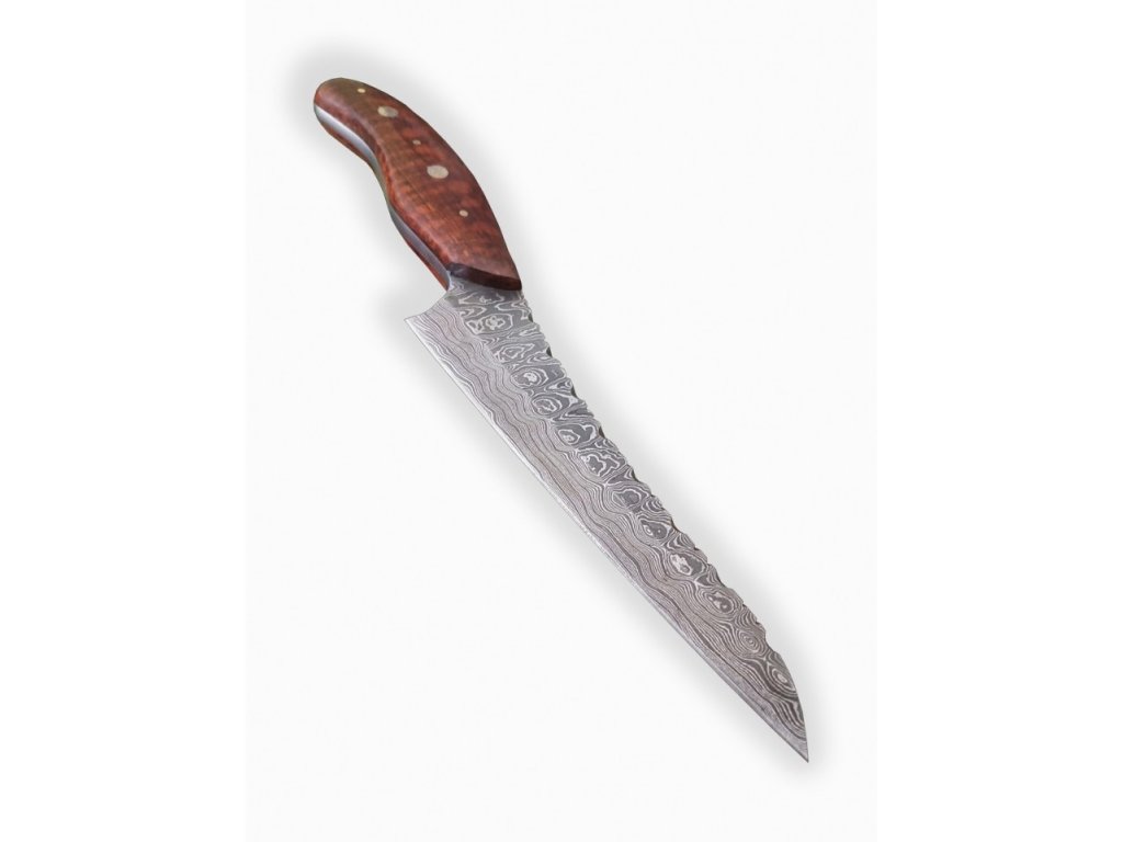 Tento nádherný 255 mm dlouhý ručně vyráběný nůž z damascénské oceli oživí Vaše smysly. Tento nůž není v žádném případě jemným nástrojem. Svojí váhou je tento nůž šelma, která snadno rozseká zeleninu a s lehkostí rozřeže maso.