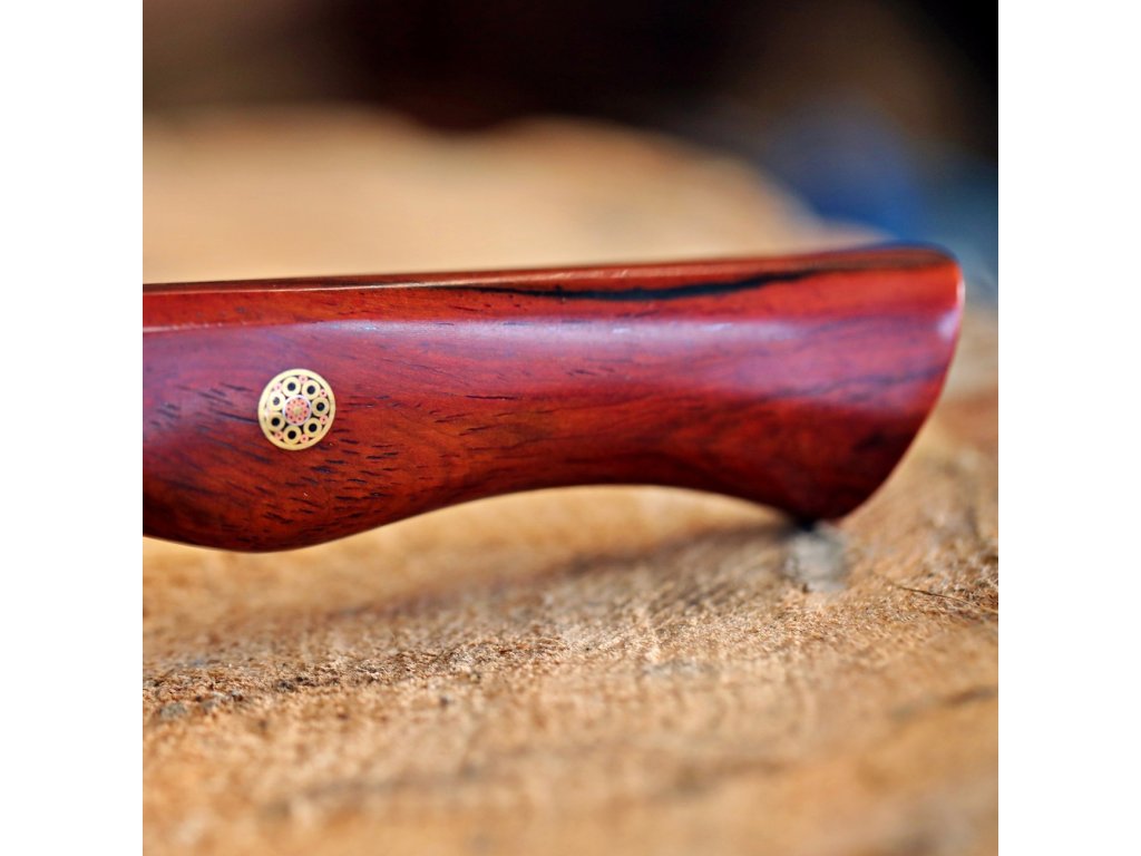 Rukojeť západního stylu je vyrobena ze dřeva palisandru a je ozdobena stylovým ozdobným nýtem. Vždy je pečlivě ručně leštěná, ergonomicky tvarovaná a navržena pro vynikající ruční ovládání. Krásná, tmavě hnědá, dřevěná rukojeť dobře sedí ve Vaší ruce a je jedno zda jste pravák, nebo levák.