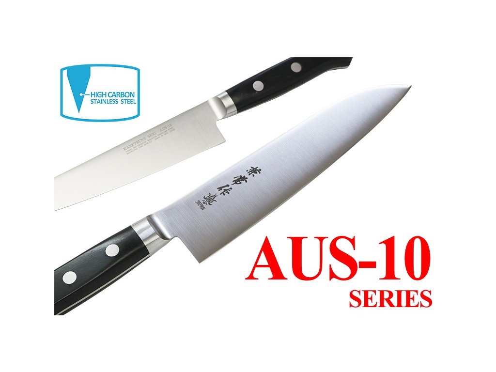 Výjimečně ostrý kuchařský nůž Gyuto o délce 210 mm z prémiové řady Kanetsune AUS 10 PRO je navržen pro náročné profesionály i domácí šéfkuchaře. Čepel je vyrobena z japonské nerezové oceli AUS-10 s obsahem uhlíku 0,95–1,10 %, doplněné o pečlivě vyváženou kombinaci molybdenu, vanadu a dalších legur. Díky tomu nabízí vynikající odolnost vůči korozi, vysokou houževnatost a tvrdost 59–60 HRC.