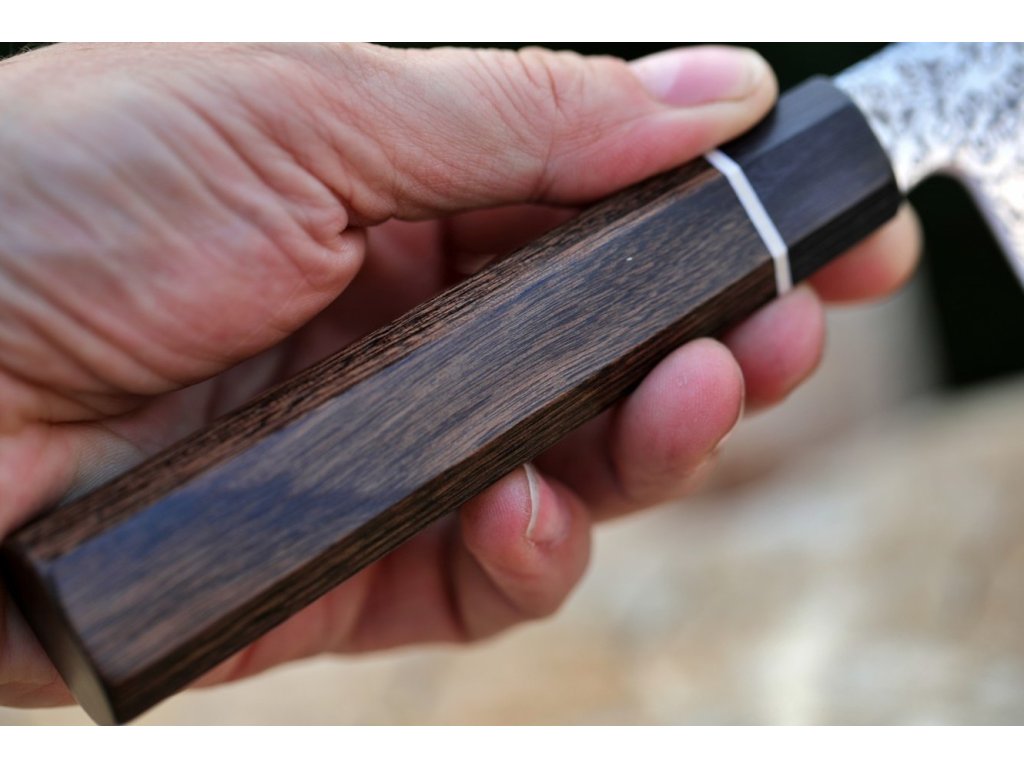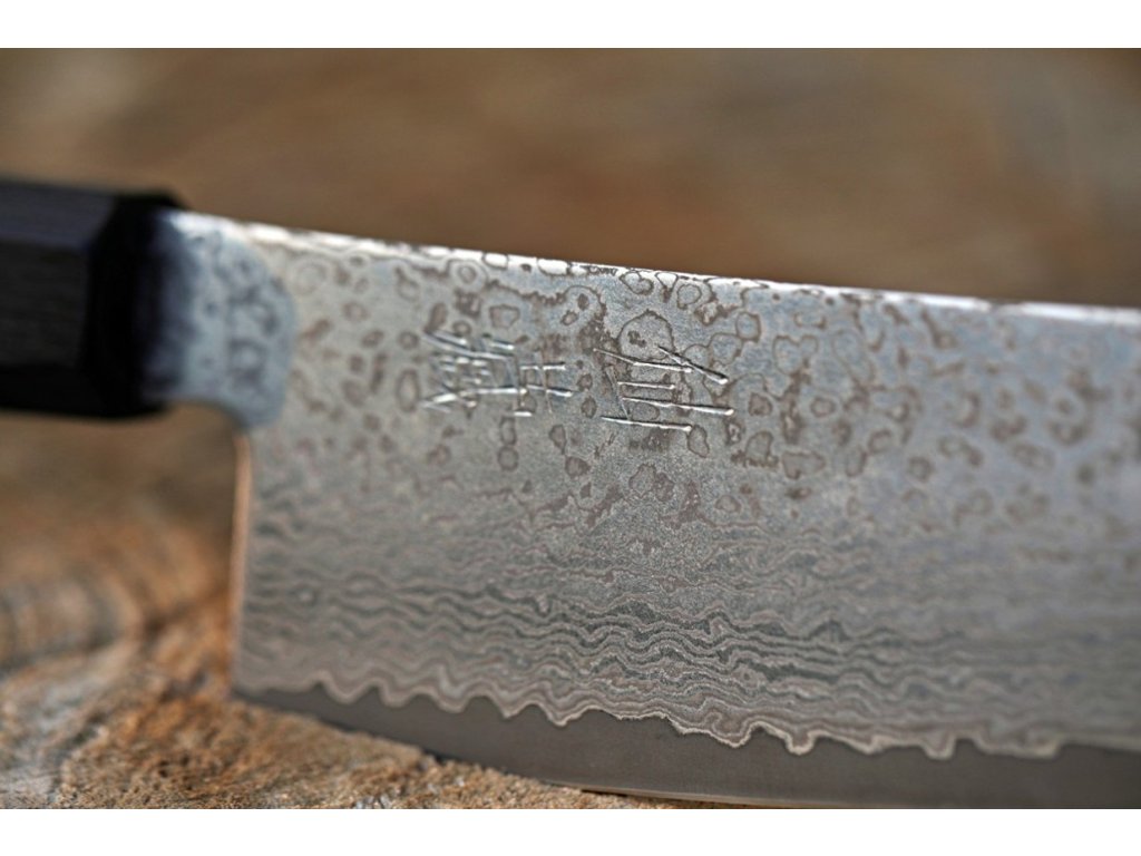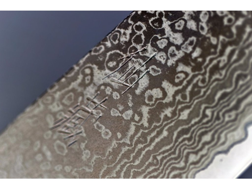 - Čepel: Vyrobena z ultra ostré japonské oceli VG-10, která je známá svou vynikající odolností proti korozi a dlouhotrvající ostrostí. Čepel je obklopena 66 vrstvami nerezové damascénské oceli SS316, které poskytují mimořádnou odolnost a houževnatost. Tento nůž prochází kalením ve vakuových pecích (vacuum heat treatment) a je ručně broušený, což přispívá k jeho tvrdosti okolo 61 HRC a extrémní ostrosti. Na povrchu čepele je krásný damascénský vzor.
