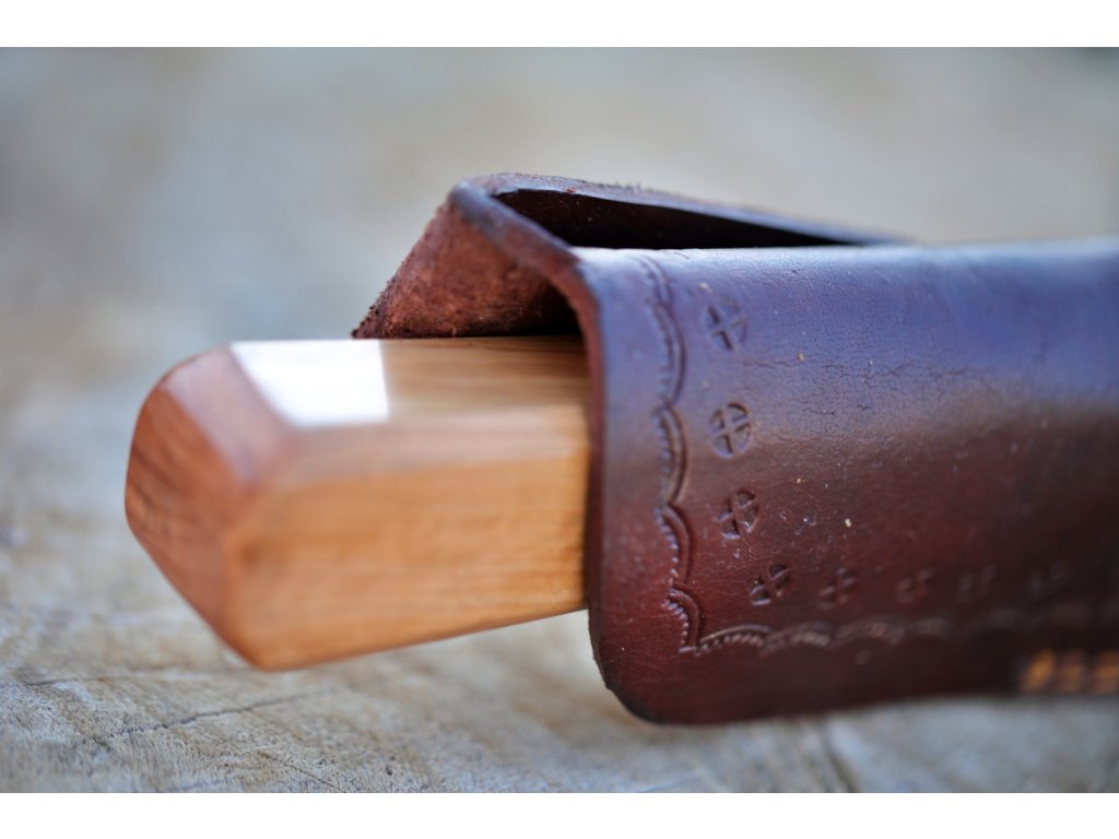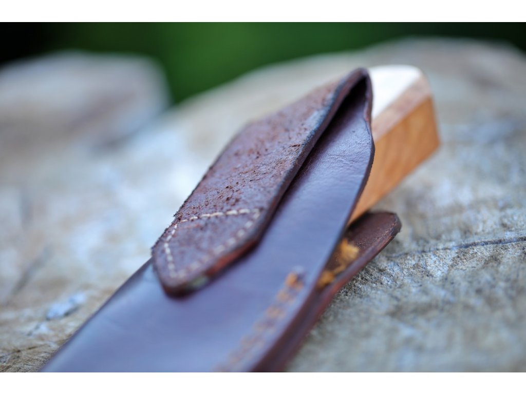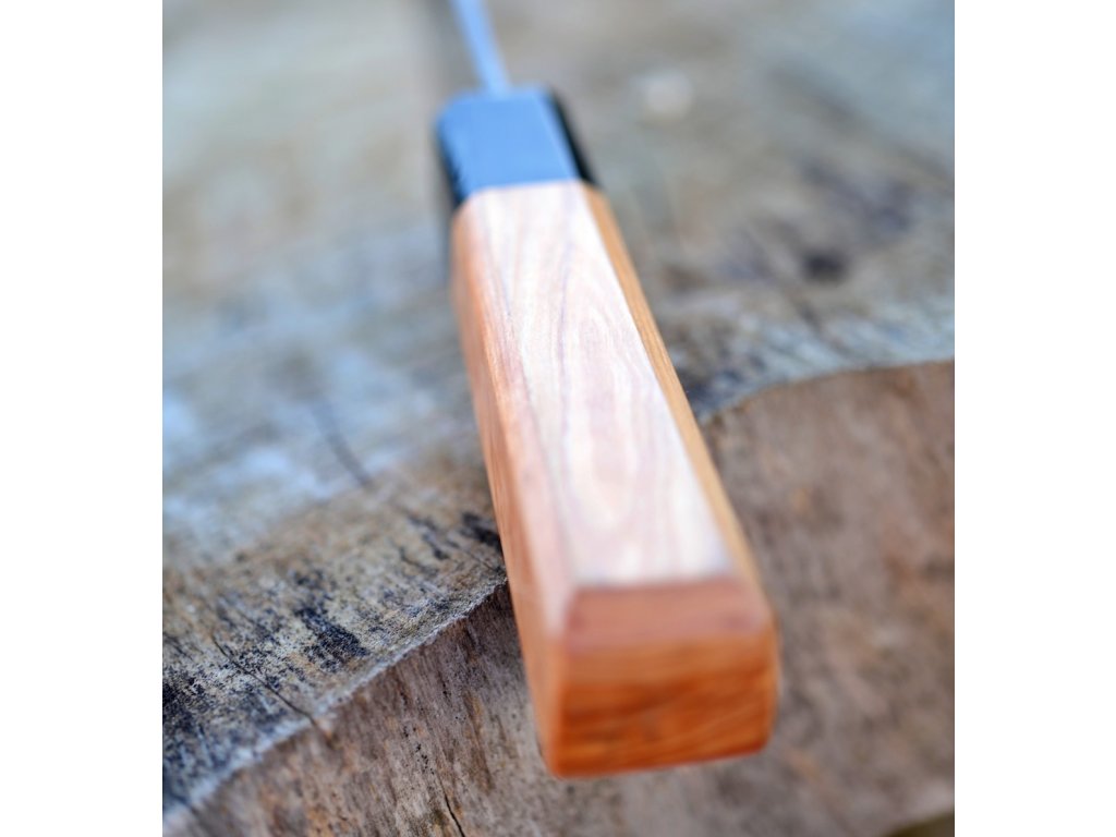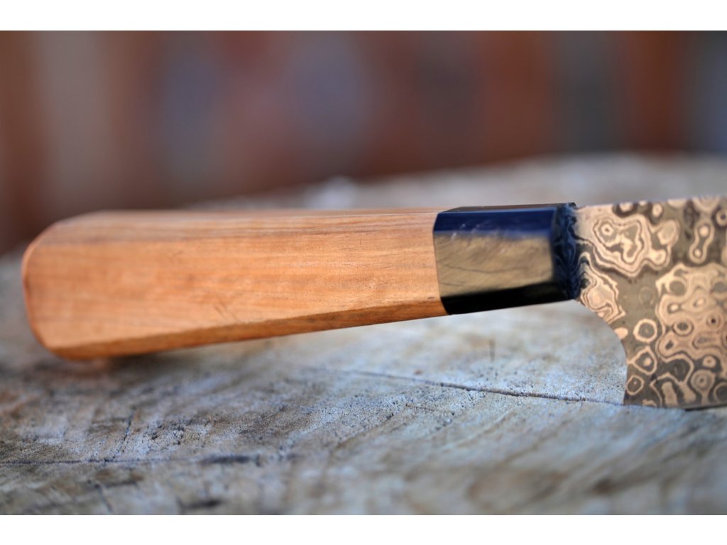 Rukojeť je z olivového dřeva v kombinaci s bůvolím rohem.