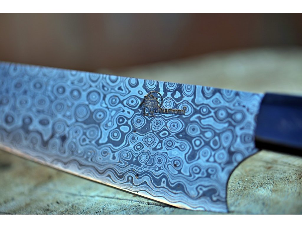 Tento nádherný 340 mm dlouhý ručně vyráběný kuchařský nůž z damascénské oceli oživí Vaše smysly. Tento nůž není v žádném případě jemným nástrojem. Svojí váhou je tento nůž šelma, která snadno rozseká zeleninu a s lehkostí rozřeže maso.