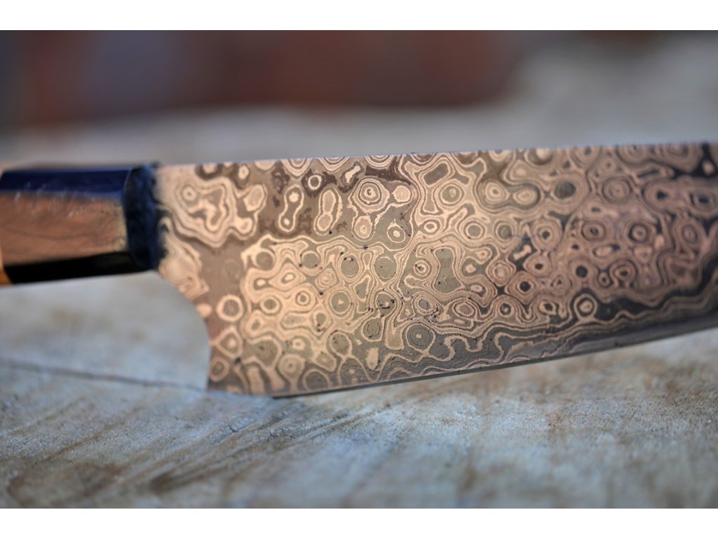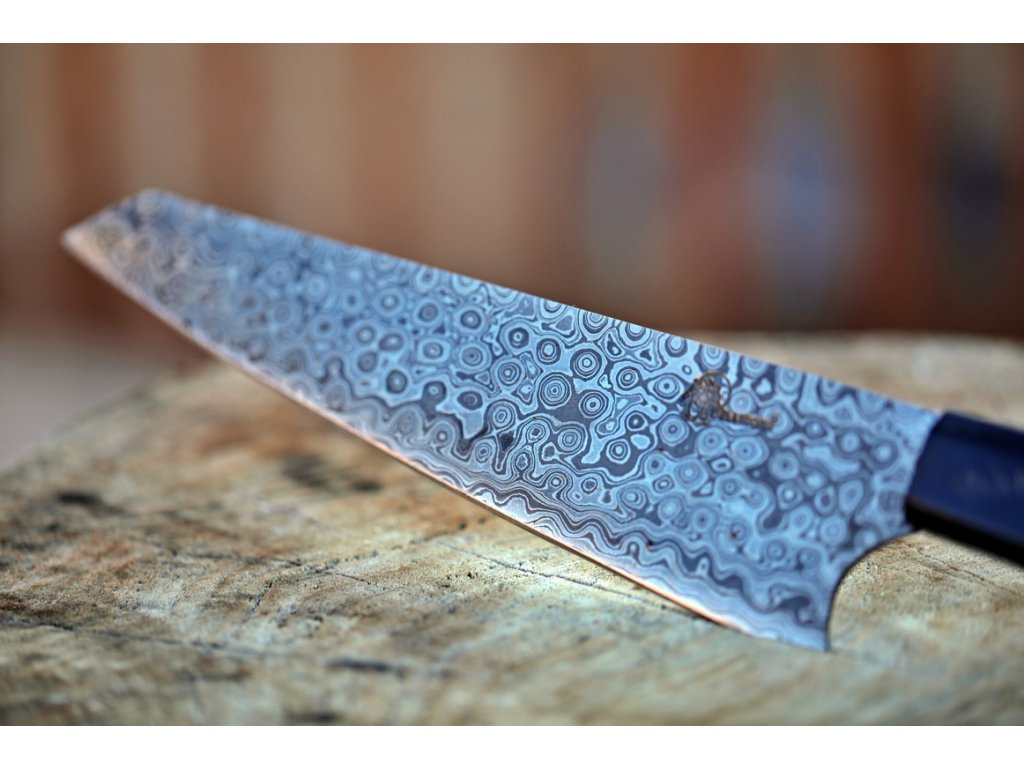 Nůž je vyroben z 352 ručně překládaných vrstev ocelí 1095 a 15n20. Vysoký obsah uhlíku 1095 dává tomuto noži extrémně ostré a trvanlivé ostří. Činí z něj ideální volbu pro všechny kuchaře z celého světa. Uhlíkové oceli je mnohem snazší ostřit než nerezové nože. Postupem času Váš nůž "Capo Damascato" přijme krásnou patinu a opravdu se stane jedinečným uměleckým dílem, které je zcela vaše.