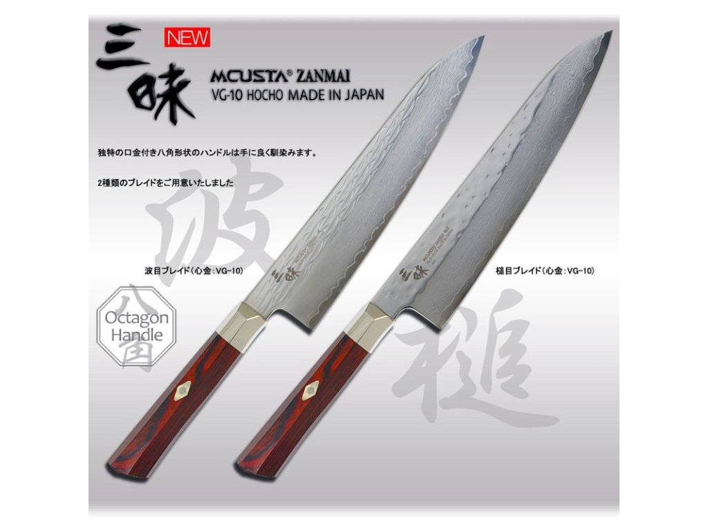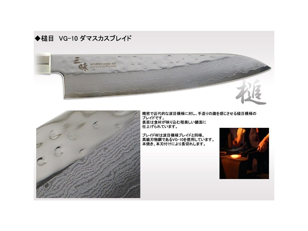 - materiál čepele: 32 vrstev damascenské oceli a jádro z VG-10 (C-1%, Cr-15%, Mo-1%, V-0.2%, Co-1,5%)
