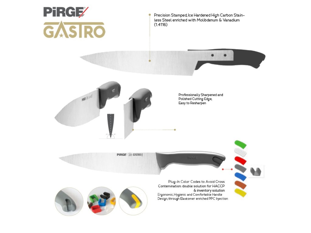 Rukojeť profesionálních nožů Pirge GASTRO je ergonomická, lehká, hygienická a pohodlná dlouhodobé používání. Rukojeť je ze vstřikovaného polypropylenu (PPC), který je odolný pro teploty do 120 stupňů Celsia a umožňuje trvalé a stabilní spojení čepele s rukojetí. Barva nástrčného pinu v rukojeti specifikuje v potravinářském průmyslu nože dle krájených surovin. To umožňuje lepší hygienickou kontrolu nad krájenými produkty a to vše na základě evropských norem HACCP.