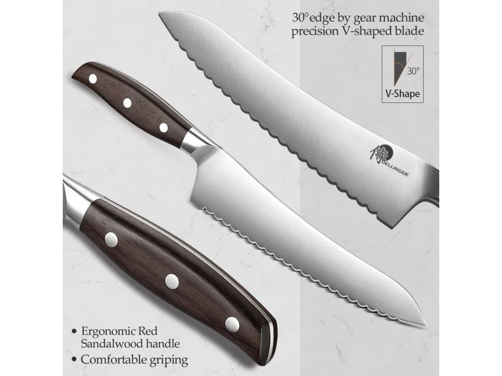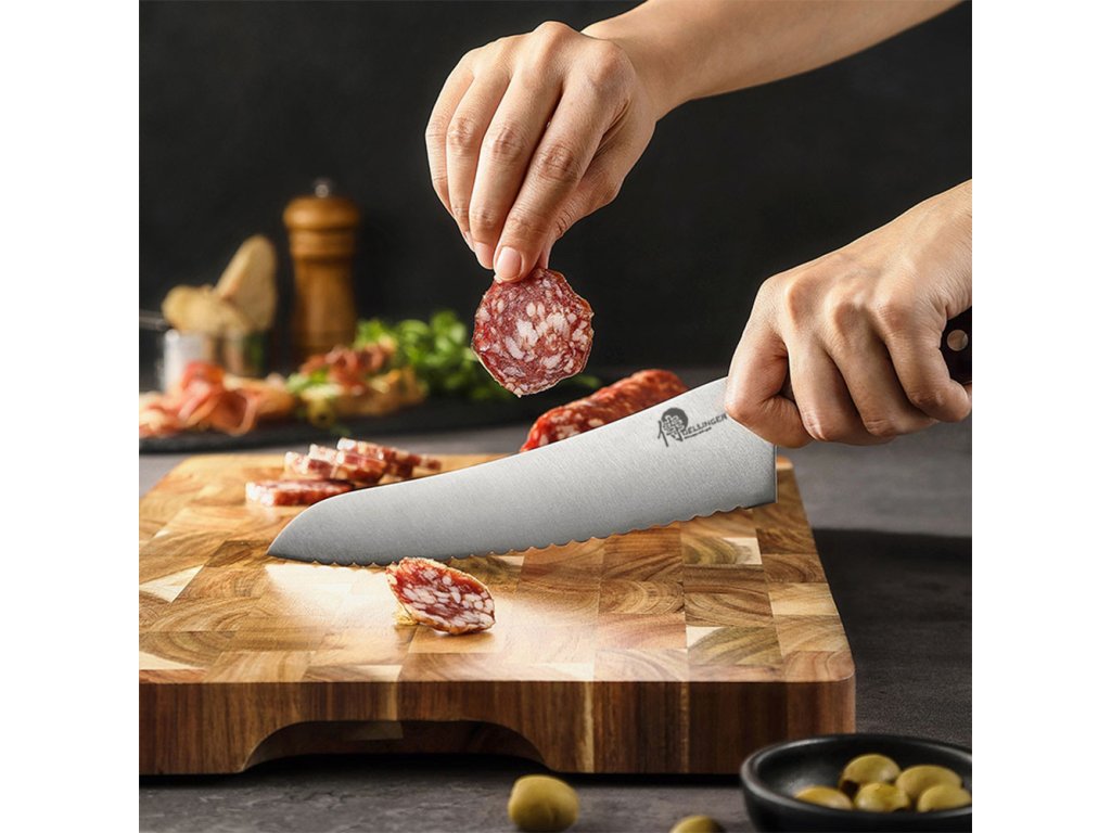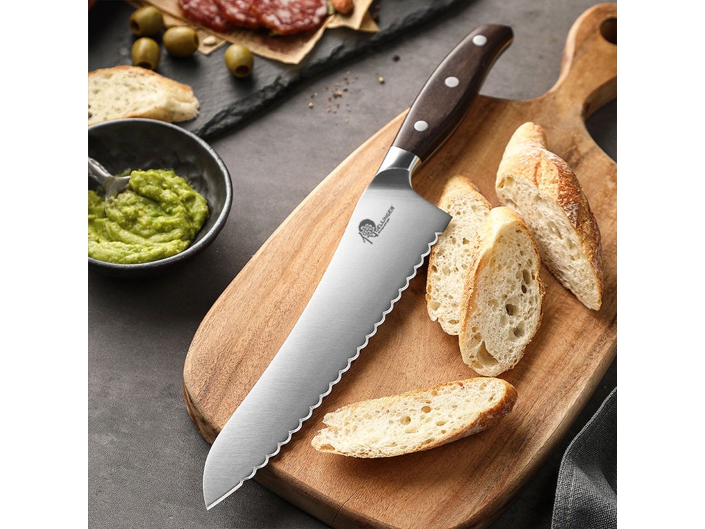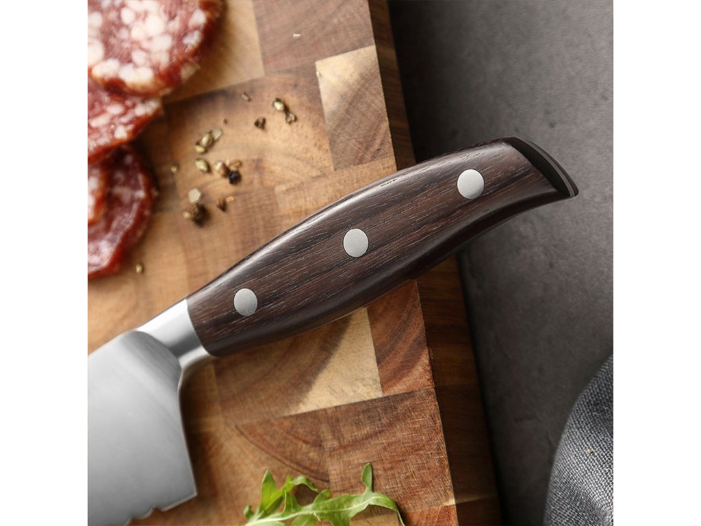 Nůž na tuhé potraviny 7,8" z řady Dellinger Classic Sandal Wood je vysoce kvalitním nástrojem pro krájení tuhých a ještě ne zcela rozmražených potravin. Jeho zubatá čepel z německé oceli 1.4116 zajišťuje precizní a pohodlné krájení, a to i při práci s pevnými potravinami. Díky své univerzálnosti může tento nůž sloužit i jako náhrada za velký šéfkuchařský nůž. Navíc je vhodný i pro krájení pečiva díky svým zoubkům.
