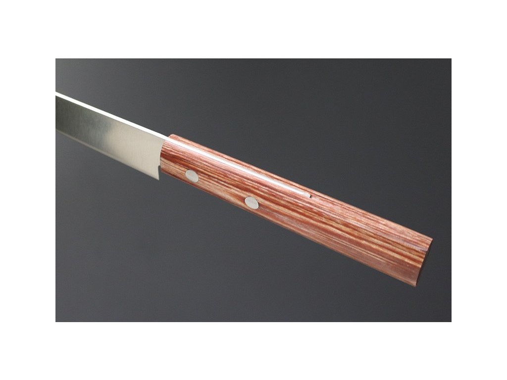 Srdcem tohohle kousku je nerezová ocel DSR-1K6 s vysokým obsahem uhlíku od japonský firmy Daido Steel. Spojuje trvanlivost nerezovky s ostrostí uhlíkovky – ideální kombo pro každodenní dřinu. A díky tvrdosti ostří nemusíš brousit po každým salátu.