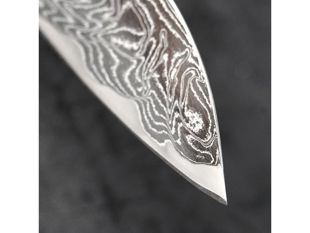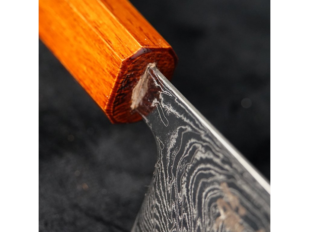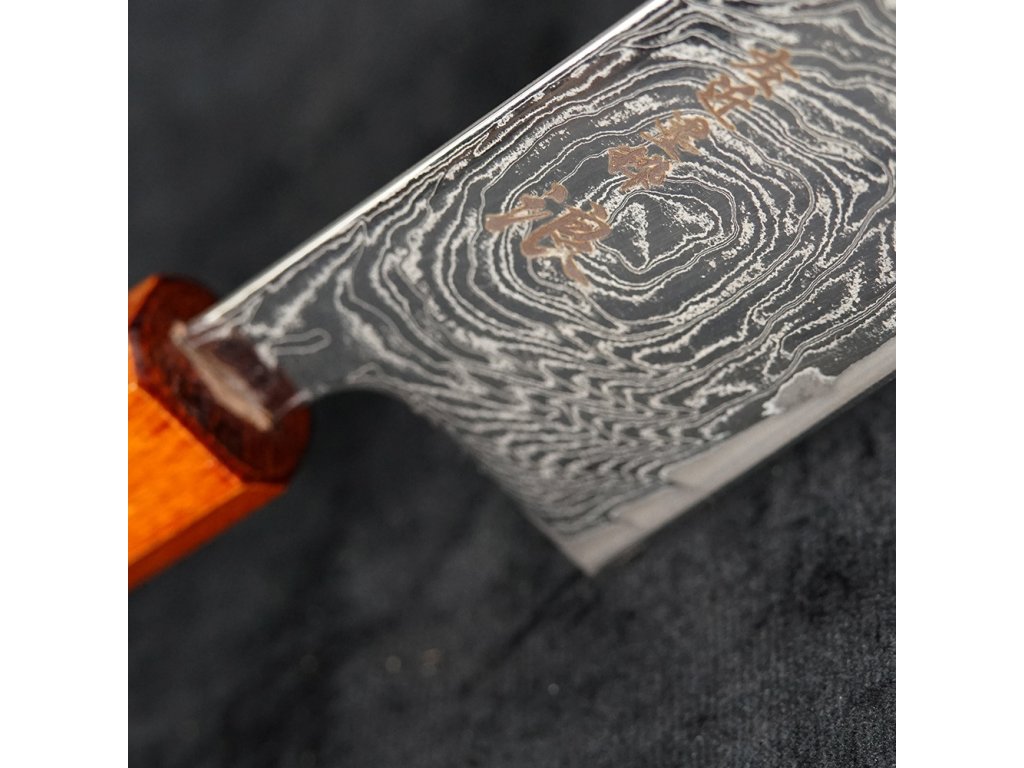 Tento nůž vás okouzlí svou jedinečnou čepelí s 32vrstvým damaškovým vzorem, známým jako „vířivý damašek.“ Každá čepel je originál – nelze najít dvě stejné. Zrcadlový lesk čepele přidává na eleganci, zatímco matná linie označuje přechod mezi tvrdým jádrem z nerezové oceli Aichi AUS-10 (tvrdost 62 HRC) a měkčími ochrannými vrstvami. Tento typ konstrukce, známý jako „san-mai clad,“ zajišťuje dokonalou odolnost a ostrost.