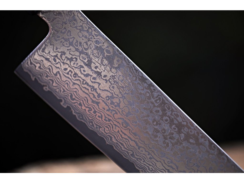 Čepele: Tento nůž je vyroben z damaškové oceli VG-10 s černým povrchem, který dodává noži unikátní vzhled a zajišťuje vynikající výkon. Damašková ocel VG-10 je známá svou vynikající ostrostí a odolností. Vyšší faseta čepele snižuje tření a zajišťuje přesné krájení, které je ideální pro různé druhy potravin, včetně masa, ryb, zeleniny a ovoce. Černý povrch dodává noži moderní vzhled a zároveň zvyšuje jeho odolnost proti korozi.