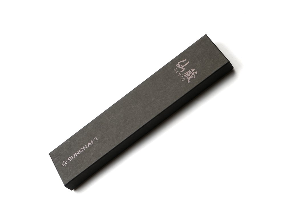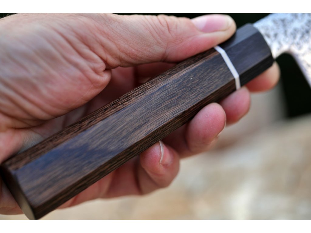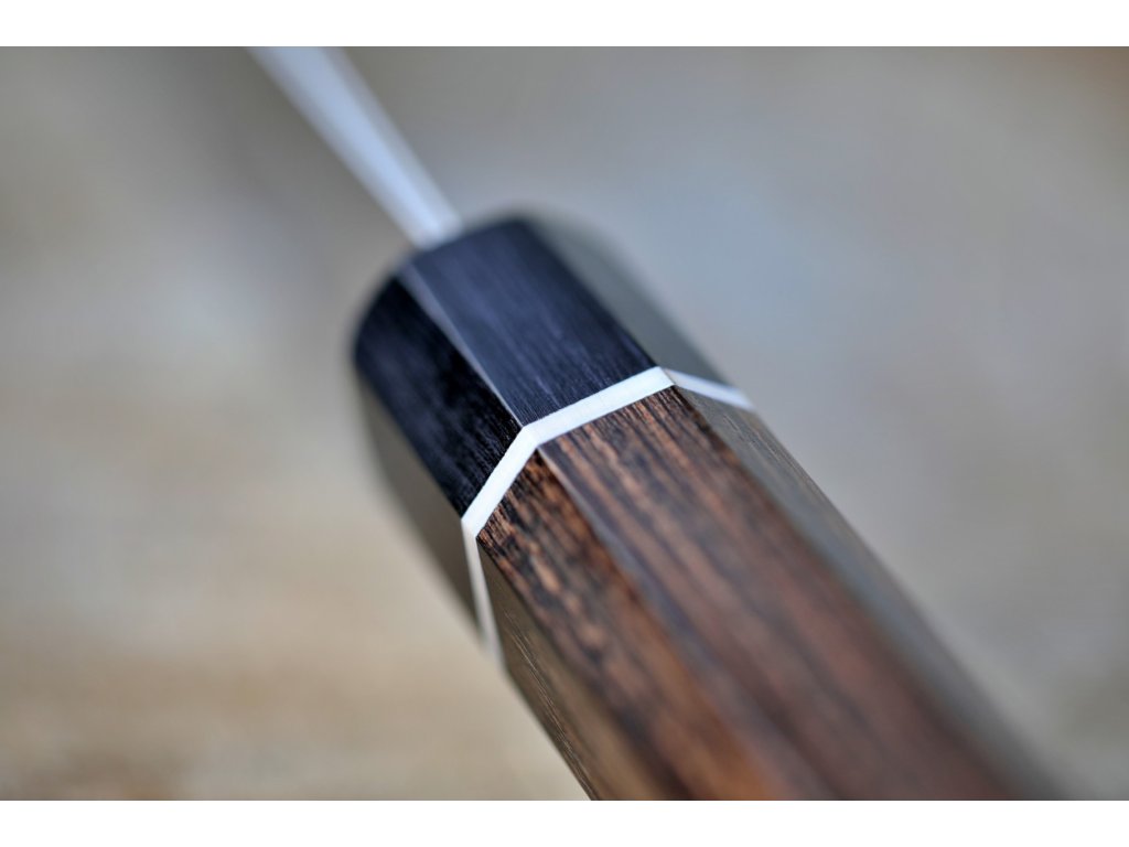 Rukojeť: Rukojeť v asijském stylu je vyrobena z Pakawood, což je směs vrstveného dřeva a epoxidové pryskyřice. Tento materiál je voděodolný, bez zápachu a nevyžaduje téměř žádnou údržbu. Rukojeť je pečlivě ručně leštěná a ergonomicky tvarovaná pro pohodlné držení. Stylový bílý kroužek přidává estetický prvek, zatímco osmiúhelníkový tvar rukojeti zajišťuje bezpečné a pohodlné uchopení pro praváky i leváky.