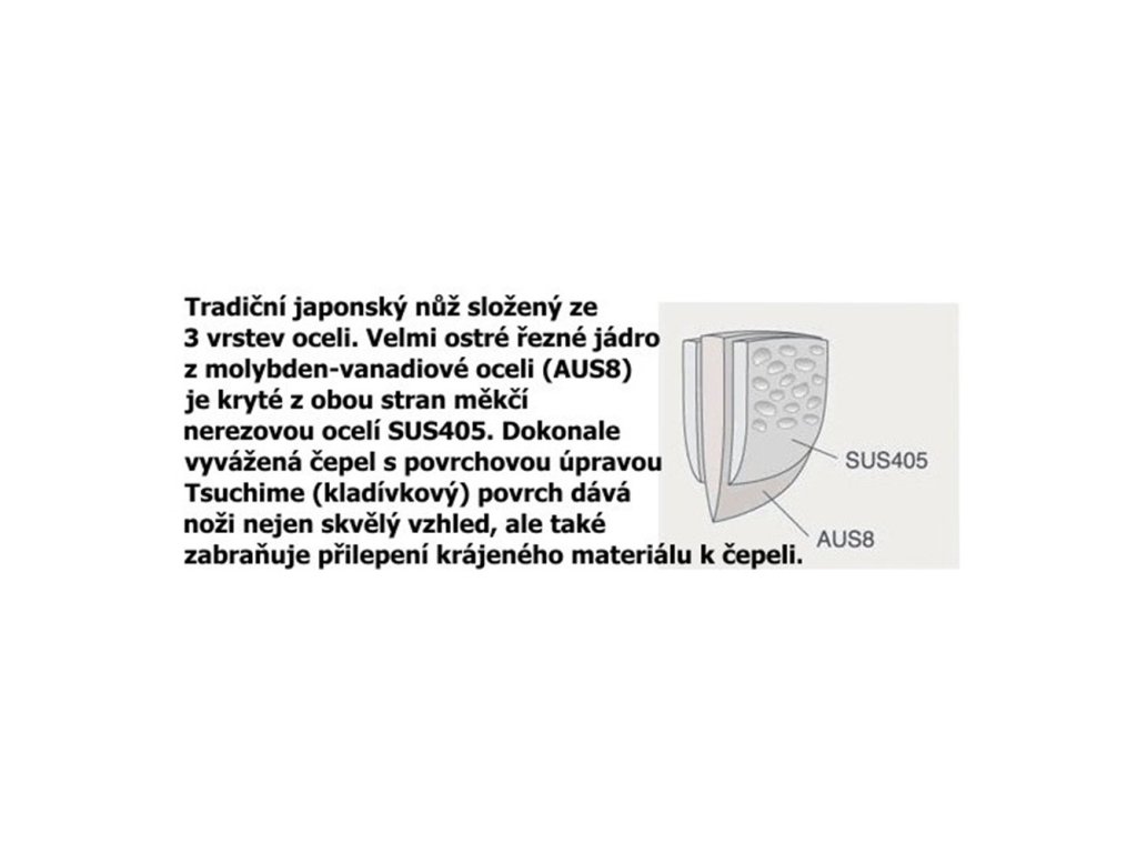 Sakon Murakumo SANTOKU 180 mm má ultra ostré řezné jádro z japonské molybden-vanadiové oceli AUS8. Má velmi dobrou ostrost hran a vynikající retenci. Je schopna dosáhnout vysoké tvrdosti okolo 60 HRC, aniž by byla křehká. Vnější povrch je z SUS-405 clad steel.