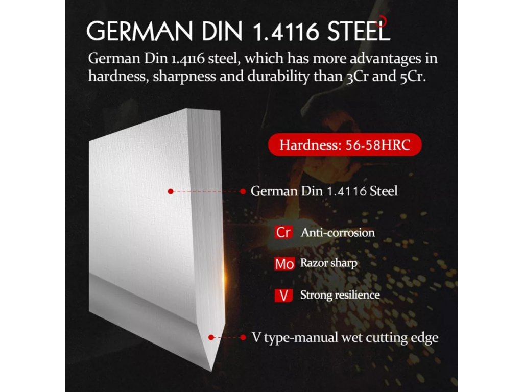 - Vysoká kvalita: Čepel vyrobená z německé oceli 1.4116 s tvrdostí HRC 56-58 zajišťuje dlouhou životnost a vysoký výkon.