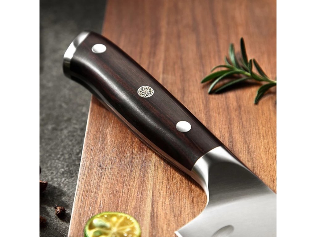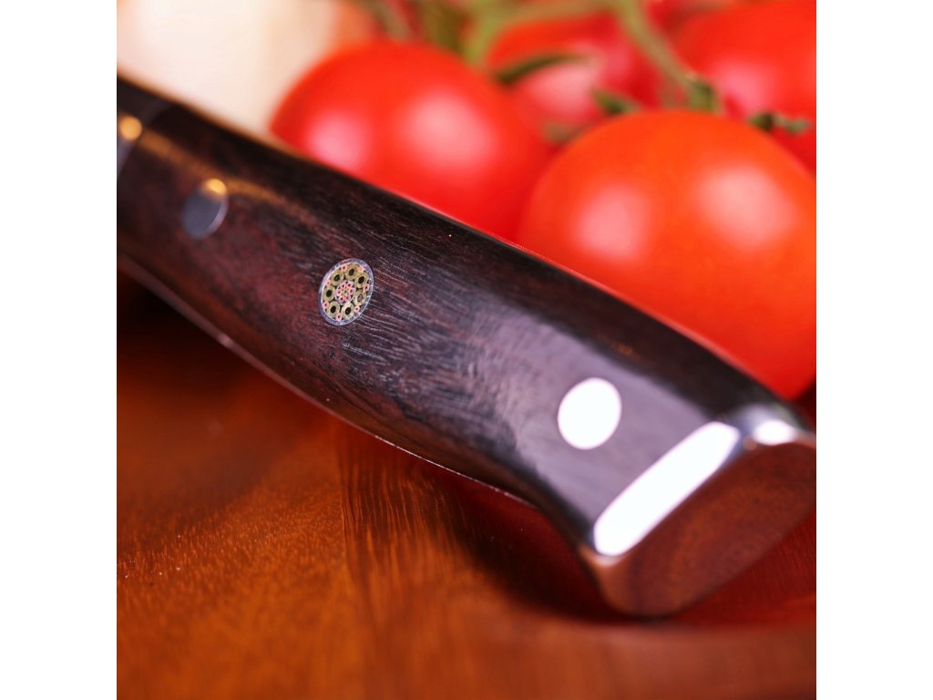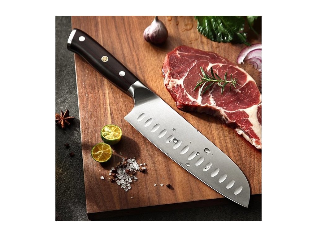 - Design: Design nože Santoku kombinuje tradiční japonský vzhled s prvky moderního zpracování. Rukojeť z ebenového dřeva je zdobena středovým mozaikovým nýtem, což poskytuje nejen skvělý vzhled, ale také ergonomický úchop.