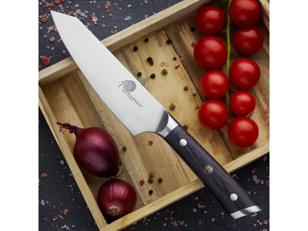 Potřebuješ všestranný nůž, co zvládne všechno od masa po bylinky? Chef / Gyuto Dellinger Black Samurai je menší parťák, který má ale pořádnou dávku výkonu. S jeho čepelí snadno nakrájíš, naporcuješ i nasekáš – od šťavnatýho steaku po jemný bylinky.