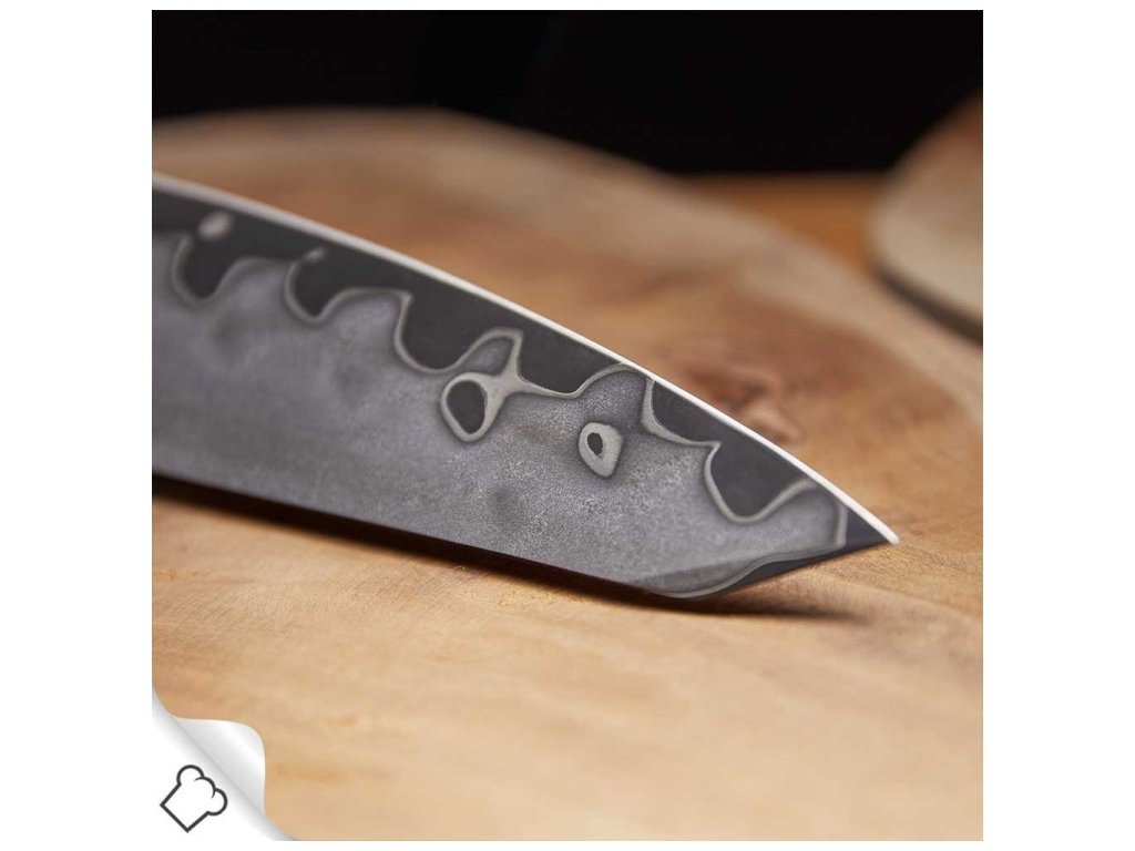 Nůž je také ideální pro kolébkové krájení bylinek, zeleniny a ořechů díky výše položenému hrotu. Dlouhá čepel a ergonomická rukojeť západního stylu zajišťují nejlepší kontrolu při řezání a krájení. Damascénský vzor připomínající rozbouřené moře minimalizuje tření při řezu a zabraňuje přilepení krájeného materiálu k čepeli.
