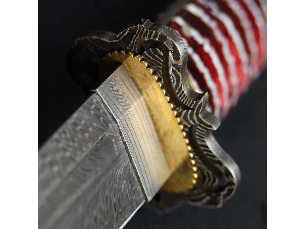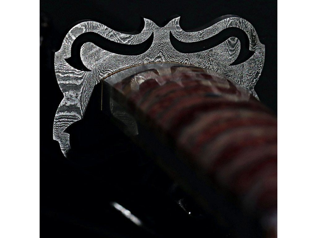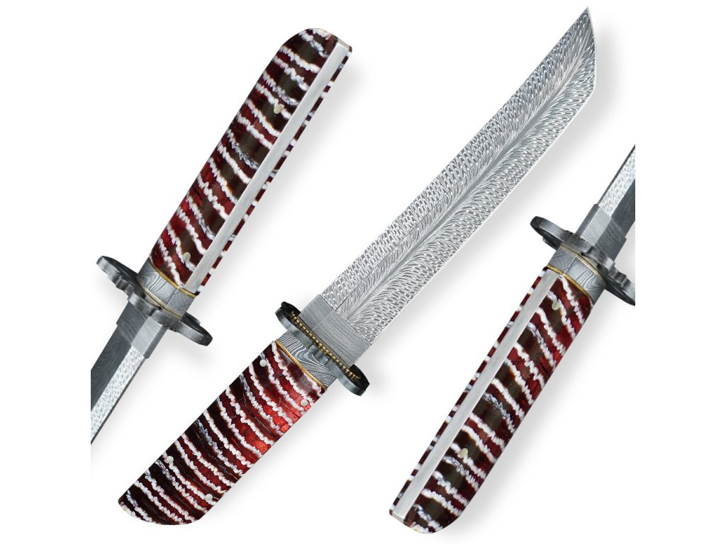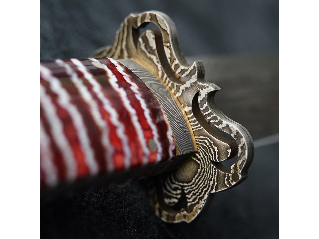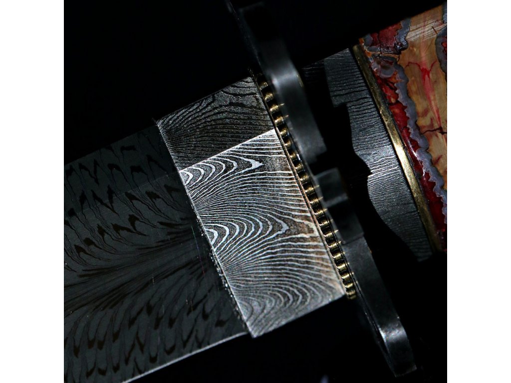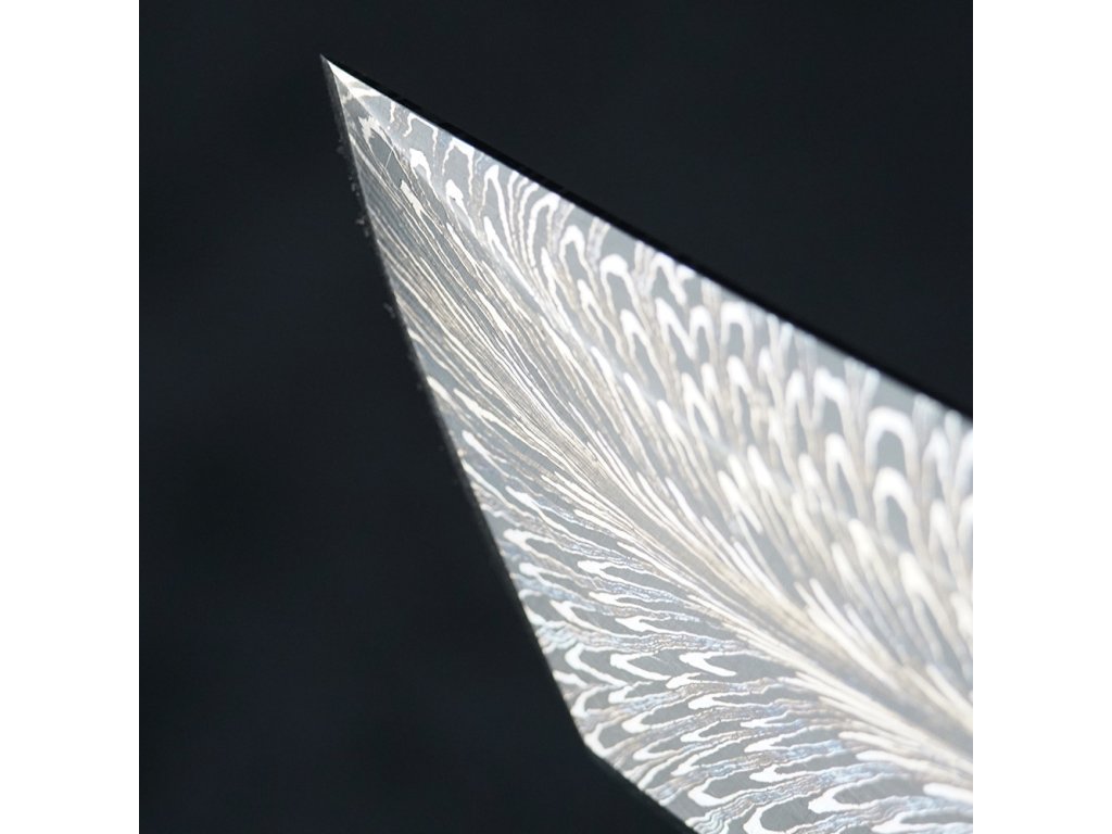 Jedinečný nůž (bylo vyrobeno pouze 5 ks v několika barevných kombinacích) - velmi kvalitní, ručně vyrobený nůž s čepelí z damaškové oceli vyrobené v USA - Randy Feather Damascus. Každý nůž je ručně broušený a při použití této oceli o tvrdosti 61-63 HRC dosahuje mimořádné až extrémní ostrosti. Střenka (tsuka) je broušená fosílie mamutího zubu se záštitou (tsuba a habaki) z damaškové oceli. Mamutí fosílie a překrásná kresba damašku Randy Feather tvoří perfektní pár - konečný výsledek je naprosto uchvacující. Více jak 10.000 let stará fosilie mamutího zubu, byla nalezena na území Sibiře. Je to vzácný a okouzlující materiál. Pouhým dotykem ucítíte poslední odkaz legendárního stvoření, které putovalo po Zemi na úsvitu lidstva.