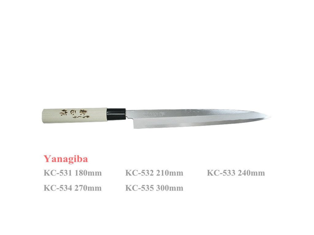 Velmi ostrý filetovací nůž Yanagiba 300 mm Kanetsune Minamoto Kanemasa B-series.Japonský typ nože Yanagiba byl vyroben ve městě Seki, které je známé výrobou nožů po celém světě. Robustní jednostranný nůž broušený v japonském stylu pouze z jedné strany. Profesionální dlouhý krájecí nůž určený k řezání tenkých plátků ryb pro sushi a sashimi. Jeho překrásná robustní čepel je schopna řezat přísady v dlouhých nepřerušovaných řezech a tím zachovat jejich celistvost a svěžest. Yanagiba je jedním z nejdůležitějších tradičních japonských nožů a je součástí repertoáru mnoha kuchařů. Dokonce i nejjednodušší úkoly s tímto krásným a funkčním nožem jsou povýšeny na mimořádný zážitek. Rukojeť je vyrobena ze dřeva topolu. Vždy je ergonomicky tvarovaná a navržena pro vynikající ruční ovládání.