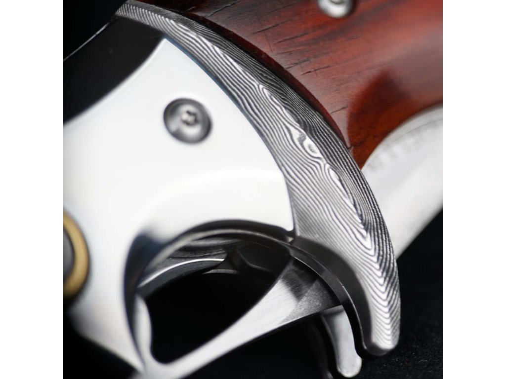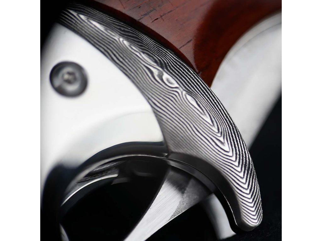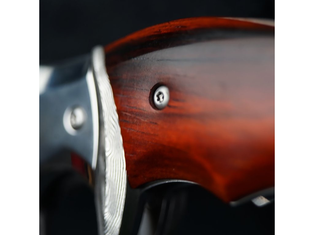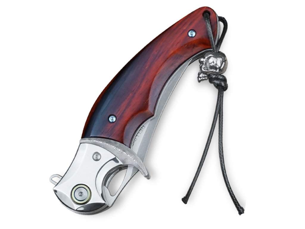 Rukojeť nože je vyrobena z exotického dřeva Iron-Wood, které je známé svou tvrdostí a odolností. Elegantní kovové detaily, masivní bolster pro jistý úchop a přívěsek ve tvaru lebky dodávají noži nezaměnitelný charakter.