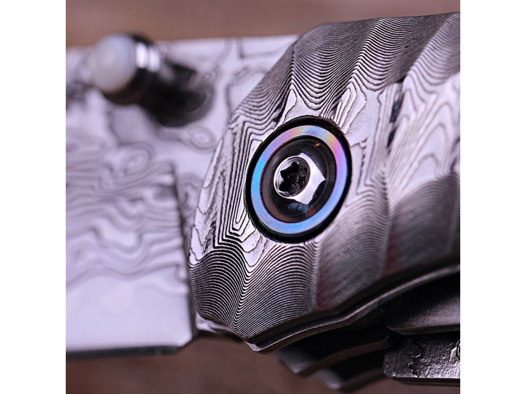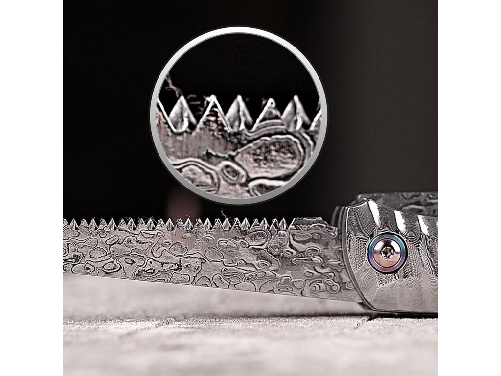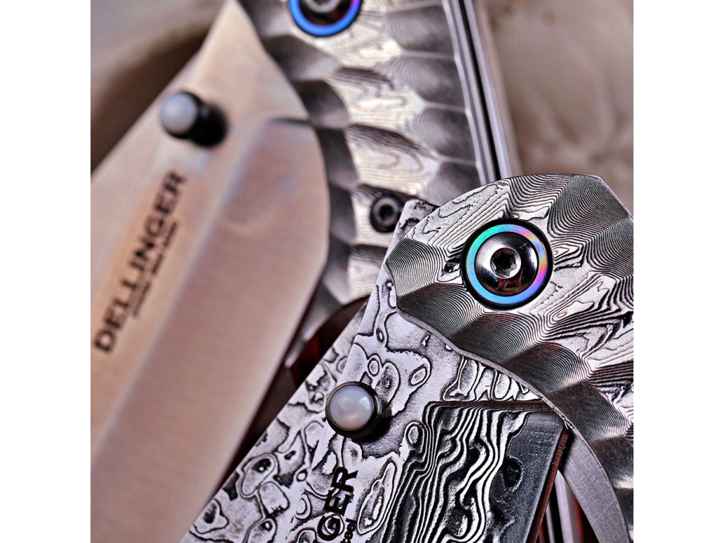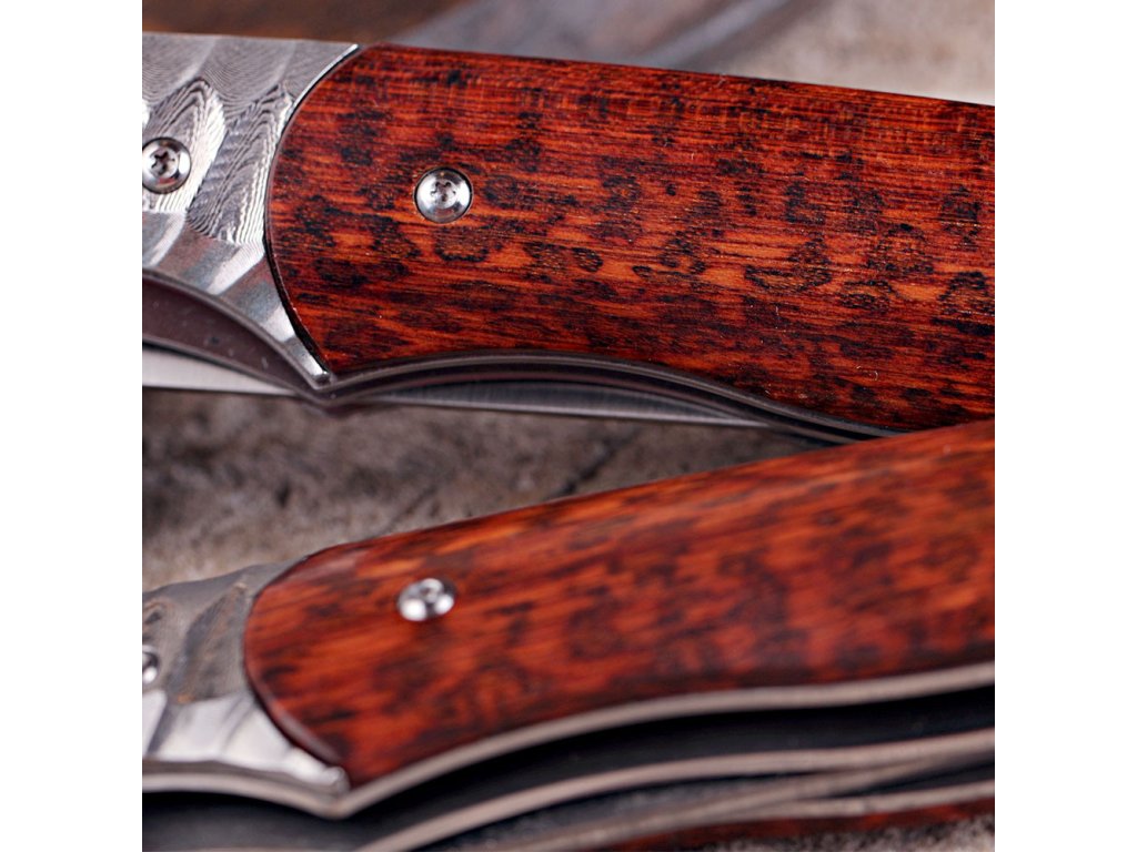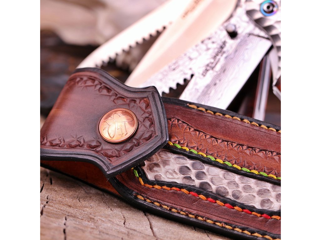 - Rukojeť: Pravé hadí dřevo (Snakewood) s masivním kováním z damaškové oceli a kroužkem z titanu, což dodává noži luxusní vzhled.
