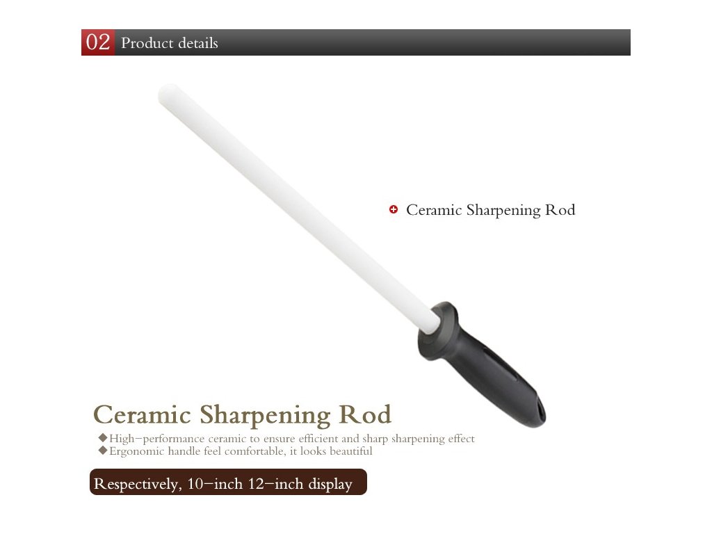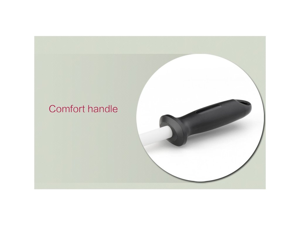 Keramická ocílka o délce 26 cm je ideální pro jemné broušení všech nožů z oceli. Doporučuje se používat pro jemné obtažení ostří, ať už po broušení na kameni nebo při běžné práci v kuchyni. Ergonomicky tvarovaná pogumovaná rukojeť poskytuje příjemný úchop i při delším používání.