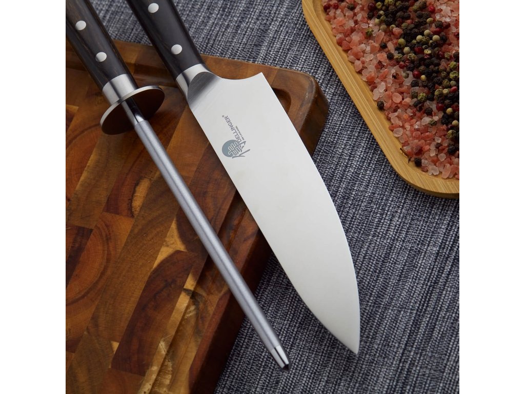 Exkluzivní sada nožů Dellinger German Black Samurai je nepostradatelným pomocníkem pro každého kuchaře. Tato sada obsahuje tři prvotřídní kuchyňské nože – nůž šéfkuchaře, univerzální nůž a malé Santoku, ideální pro všechny typy přípravných kuchyňských prací. Navíc je součástí i diamantová ocílka pro snadné a rychlé ostření, aby vaše nože byly vždy připravené na další výzvu. Všechny komponenty jsou uloženy v luxusní černé dřevěné krabici, která chrání nože a dodává sadě na eleganci.