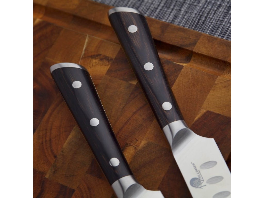 Rukojeti všech nožů v sadě jsou vyrobeny z PAKKA dřeva, které je voděodolné a odolné vůči korozi. Tato syntetická dřevina se vyznačuje elegantní černou strukturou, která je ručně leštěná a ergonomicky tvarovaná. Trojité nýtování rukojeti poskytuje maximální stabilitu a komfort při krájení, vykosťování a dalších kuchařských pracích. Díky tomuto designu se nože skvěle drží a jejich používání je pohodlné jak pro praváky, tak pro leváky.