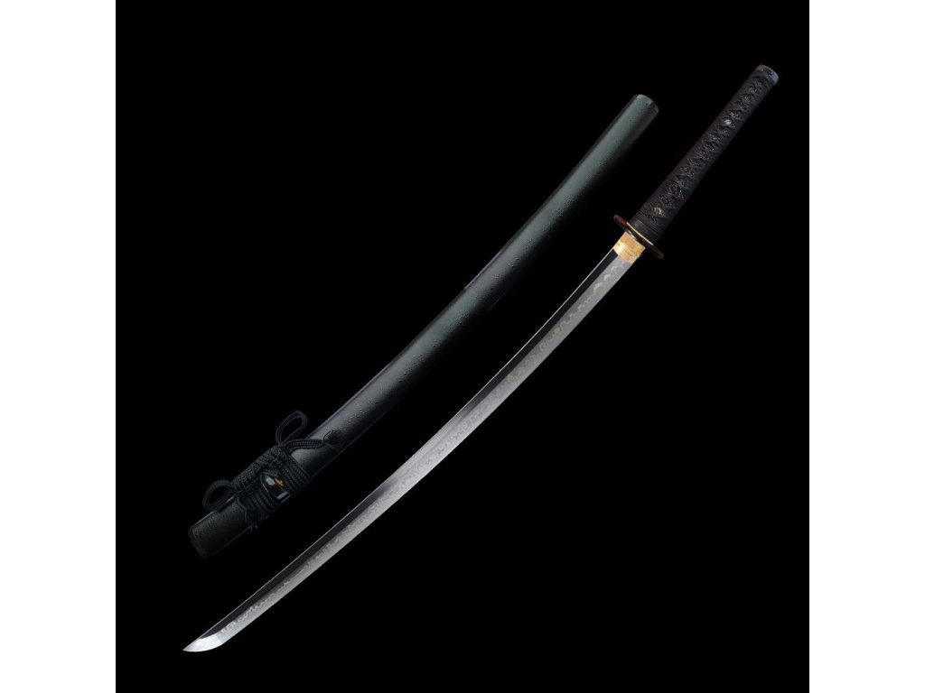 Kovaná čepel z oceli AISI 1095 té nejvyšší kvality. Ocel byla laminována v monokompositnítní konfiguraci Maru - diferenciálně tvrzená. Uhlíková ocel AISI 1095 je velmi pevná a skvěle drží ostrost. Výrazný reálný Choji Hamon je tvořen dle dávných tradičních metod, které vychází z mnohaletých zkušeností kovářského mistra. Po ručním broušení a leštění je povrch čepele jako zrcadlo. Čepel byla ve finální fázi leštěna kamenem hazuya - tím je dosaženo téměř žiletkového ostří (razor sharp). Jedná se o špičkovou repliku samurajského meče, která je vhodná k sekovým zkouškám a lze ji rozložit na jednotlivé části. Tato čepel byla vyzkoušena a testována tak, aby odstranila vše co jí stojí v cestě ! Sori (zakřivení čepele) je speciálně navrženo tak, aby bylo dosaženo co možná nejjemnějších a nejčistších řezů. To vše v kombinaci s výběrem tradičního Koshirae zaručuje, že získáte to nejlepší z hlediska vzhledu i funkčnosti. Uhlíková ocel AISI 1095 má působivou tvrdost ve škále HRC- perfektní kombinace této tvrdosti je podtrženo zakřivením čepele Sori, které umožňuje snadné přeseknutí tatami, slaměné rohože, nebo bambusu pro tameshigiri. Full tang konstrukce této katany výrazně zvyšuje sílu meče. Hrot čepele je tvarovaný shinogi-zukuri a chu kissaki se skutečným Diamond-Shaped Yokote, které je velmi dobře definováno tím, že hamon prochází po celé délce přes Boshi. Tento japonský meč katana je možné kombinovat do setu s Wakizashi SAKUMA (W-451)