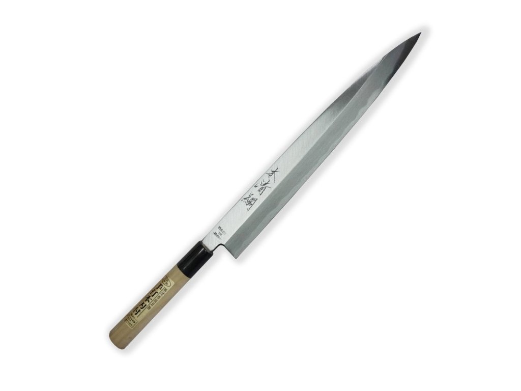 Japonský typ nože Yanagiba - robustní jednostranný nůž broušený v japonském stylu pouze z jedné strany. Profesionální dlouhý krájecí nůž určený k řezání tenkých plátků ryb pro sushi a sashimi. Jeho překrásná robustní čepel je schopna řezat přísady v dlouhých nepřerušovaných řezech a tím zachovat jejich celistvost a svěžest. Yanagiba je jedním z nejdůležitějších tradičních japonských nožů a je součástí repertoáru mnoha kuchařů. Dokonce i nejjednodušší úkoly s tímto krásným a funkčním nožem jsou povýšeny na mimořádný zážitek. Nůž je vyroben z oceli Yasuki blue steel ( Aogami ) se zvýšenou tvrdostí jádra až 61 HRC.