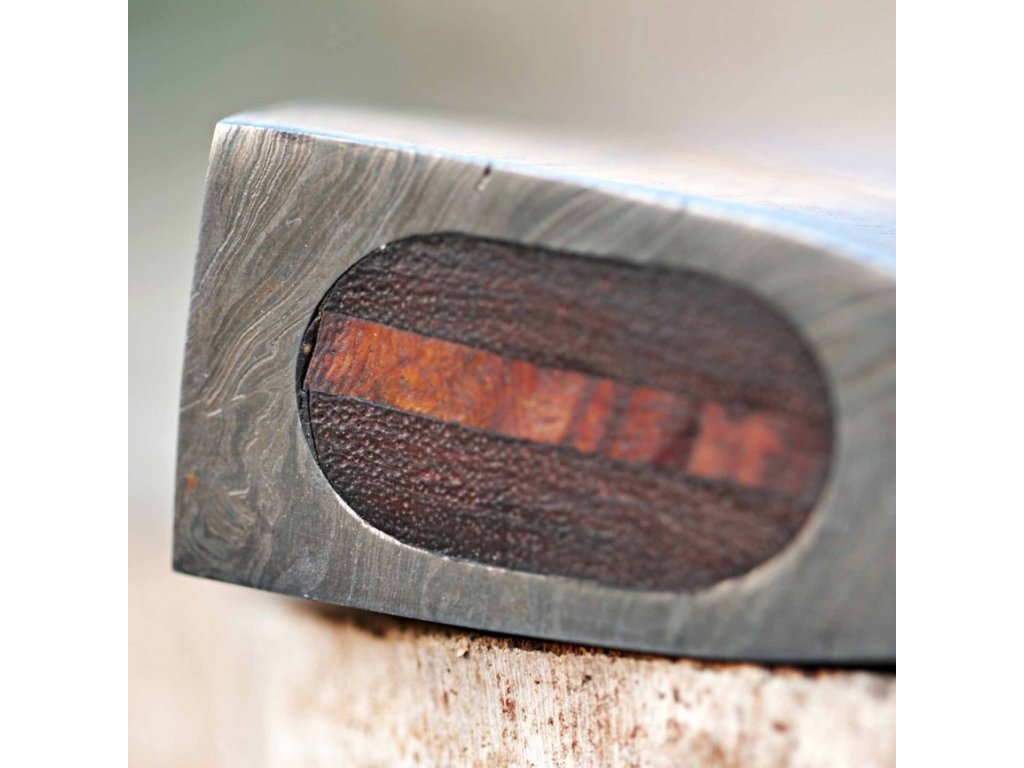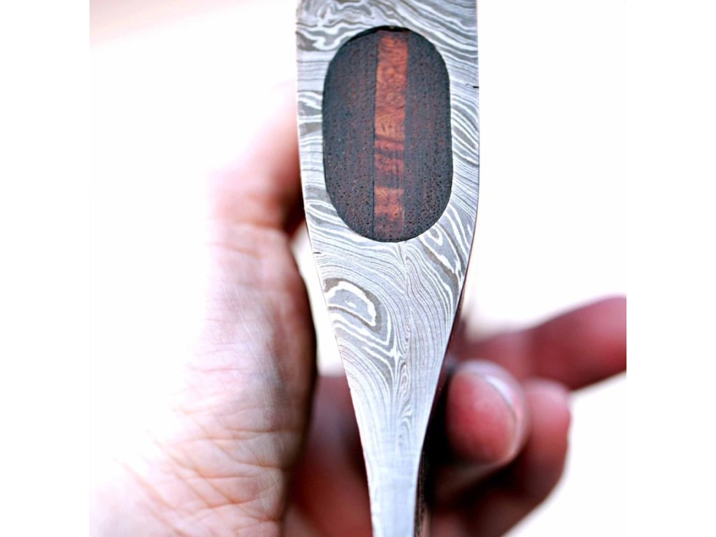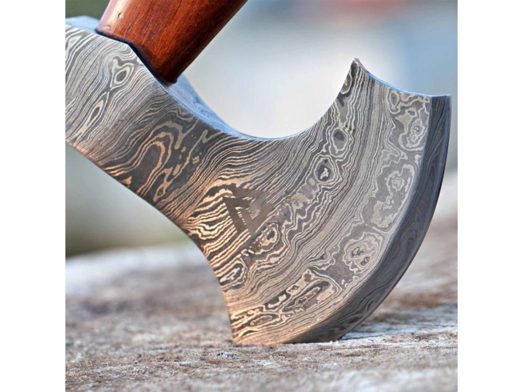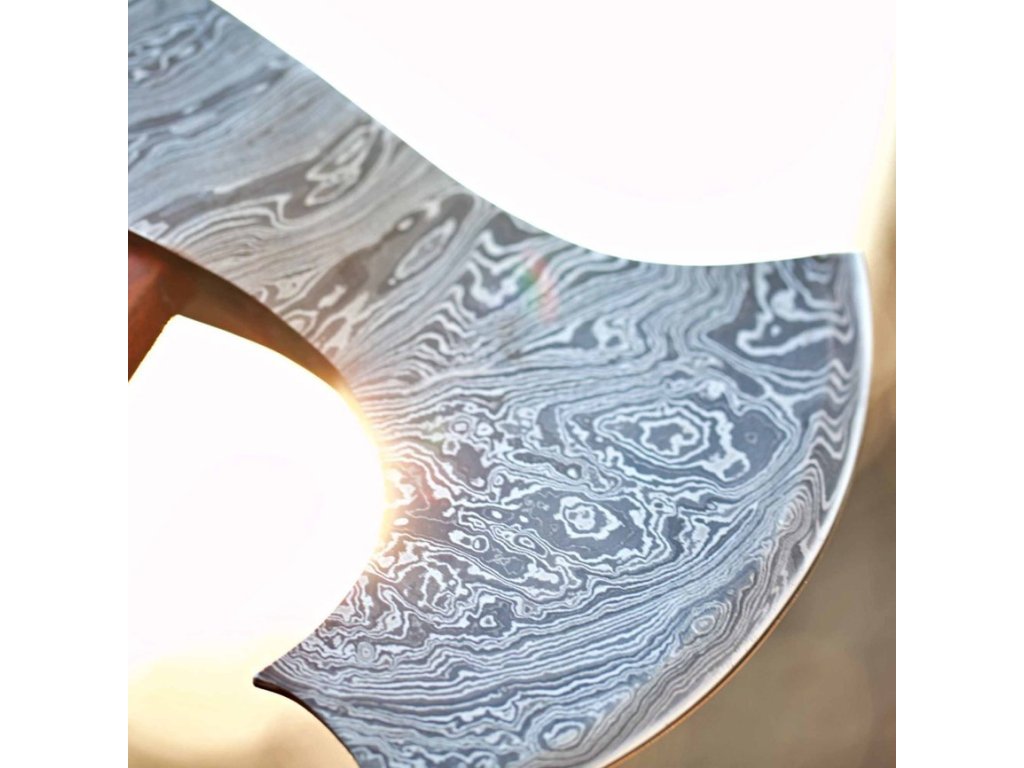 Sekera je vyrobena z 352 vrstev damascénské oceli 1095-15N20, což jí propůjčuje jedinečný a nezaměnitelný vzhled. Rozsah tvrdosti mezi 55-60 HRC na Rockwellově stupnici zaručuje vysokou odolnost a dlouhou životnost. Každá vrstva oceli má specifickou tvrdost podle typu použité oceli, což zajišťuje optimální výkon.