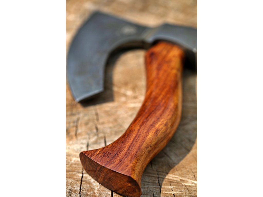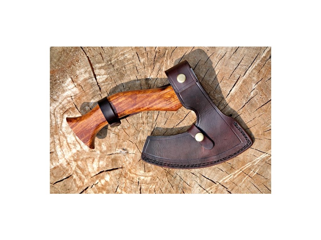 Rukojeť je vyrobena z kvalitního palisandru (SISSO Wood), který zajišťuje pohodlné a stabilní uchopení. Kožené pouzdro přichází jako součást balení a usnadňuje přenášení sekery na vaše outdoorové výpravy nebo dobrodružství.