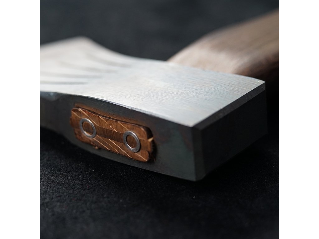 - Materiál hlavy: Hlava sekery je vyrobena z laminované oceli Warikomi, která se skládá ze tří vrstev oceli. Jádro sekery je z japonské oceli SHIROGAMI 2 s obsahem 0,45% uhlíku, zatímco okolní ocel je měkčí. Tato kombinace zajišťuje tvrdé jádro a měkčí obal pro lepší absorbci úderu a dlouhou životnost.