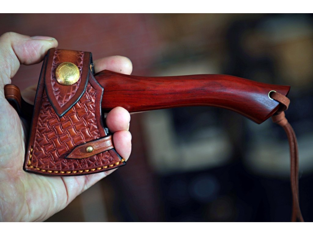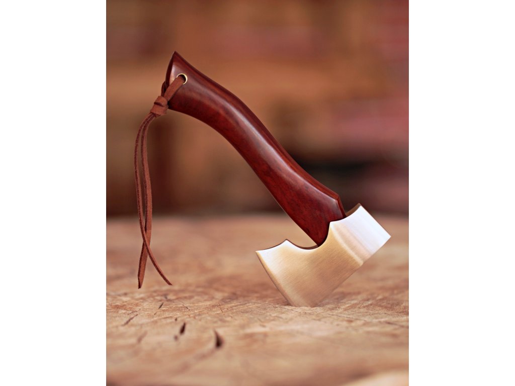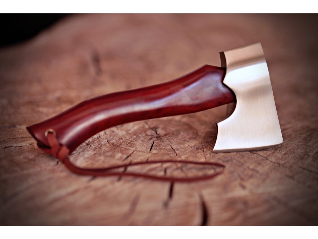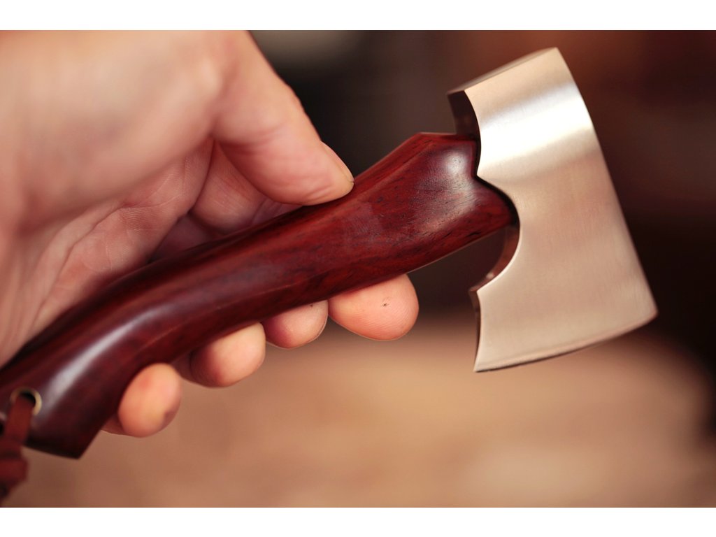 Rukojeť: Rukojeť sekerky je vyrobena z exotického dřeva Palisandru (Rosewood, Sisso). Každý kus je pečlivě ručně leštěný a ergonomicky tvarovaný, což zajišťuje pohodlné a efektivní ovládání. Palisandr je známý svou odolností a krásným vzhledem, který přidává sekérce luxusní a jedinečný vzhled.