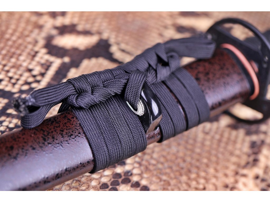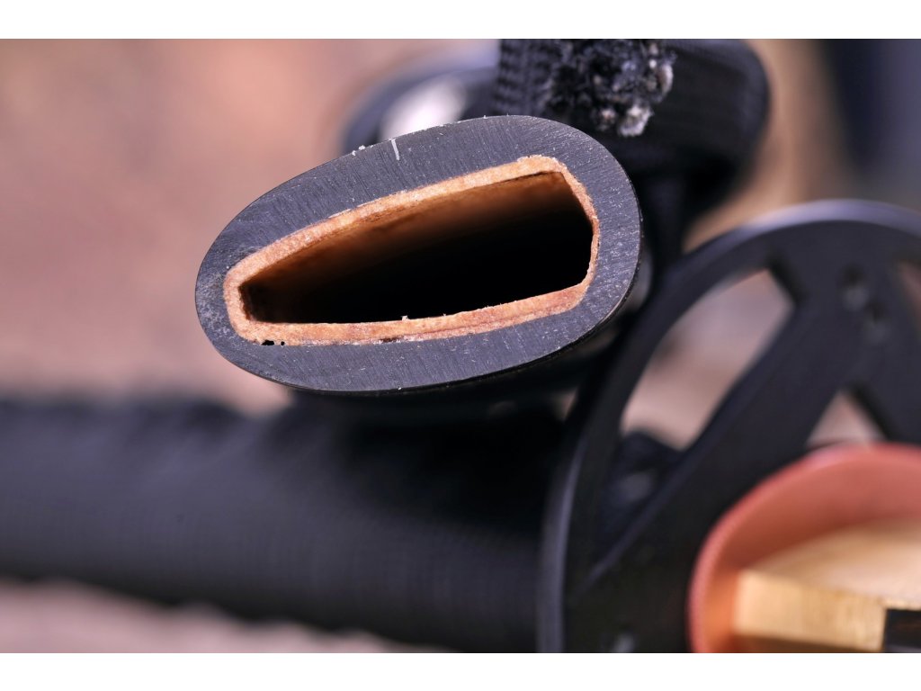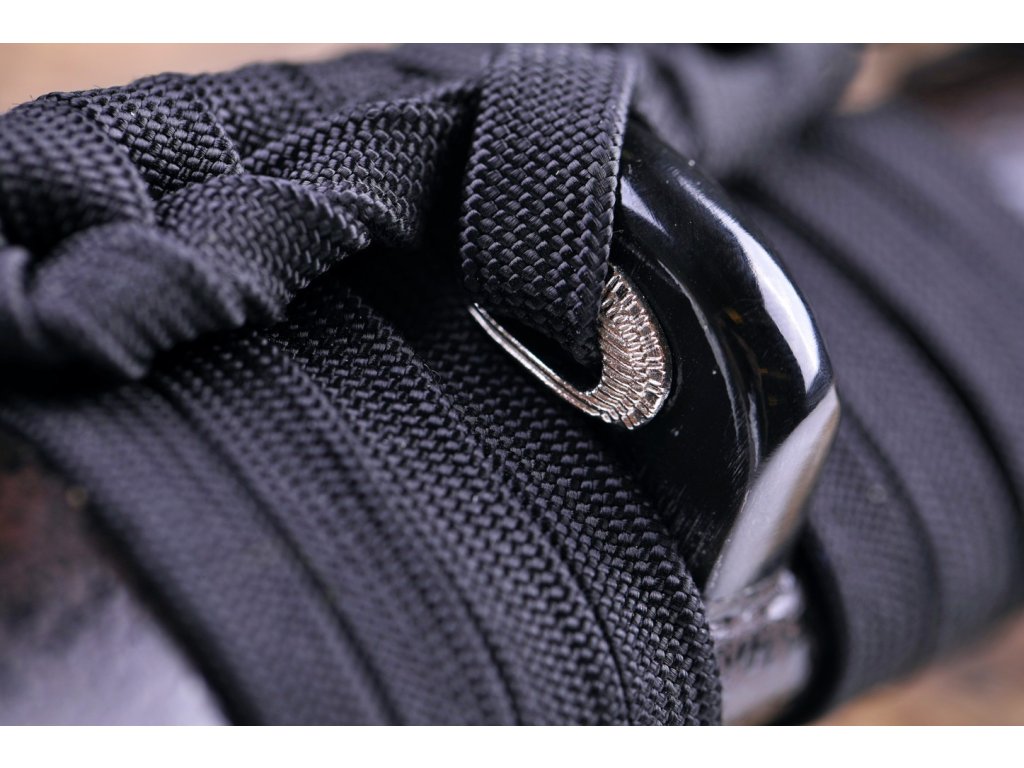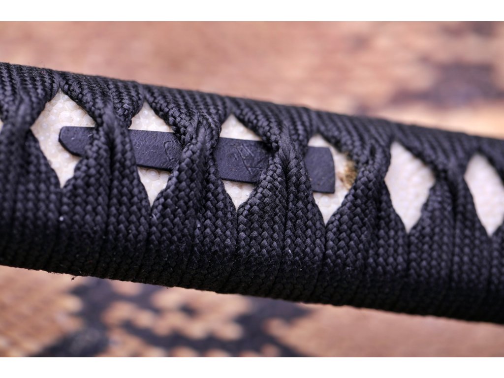 • Tsuka - dřevěné jádro, potažena pravou rejnočí kůží (Samegawa), s černou omotávkou z pravého japonského hedvábí Ito, zabalené ve stylu morotsunami maki. Čepel zajištěna 2 kolíky "mekugi". Menuki (ornament) je z obou stran Tsuky.