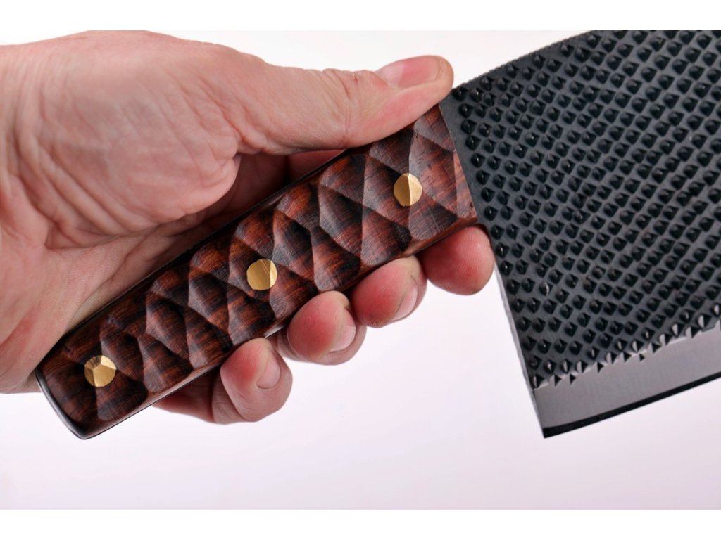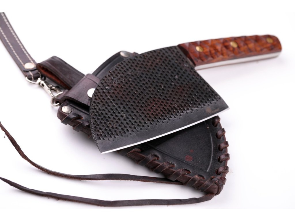 - Konstrukce: Ručně kovaný z oceli D2, která po pečlivém vytvrzení a temperování dosahuje tvrdosti Rockwell 60-62 (HRC). Nůž má tloušťku ostří 5 mm, což zajišťuje jeho vysokou odolnost a dlouhou životnost.