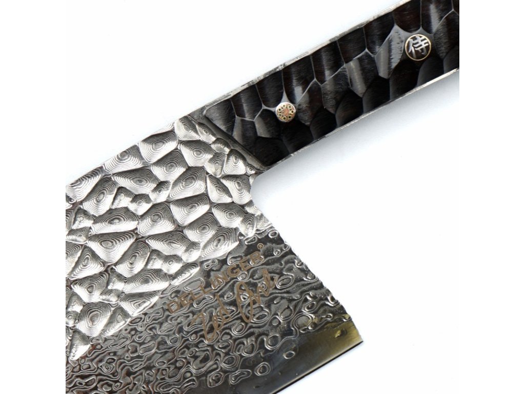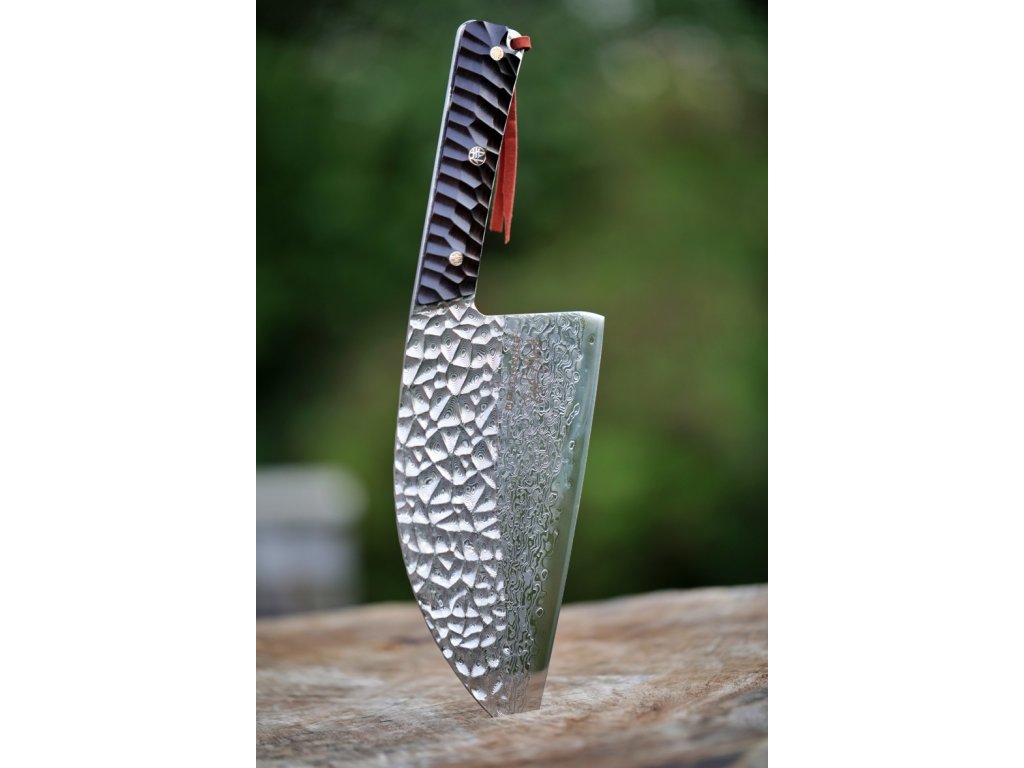 Kdo potřebuje mnoho nástrojů k přípravě jídla ? Vy nyní určitě již ne ! S tímto fantastickým nožem zvládnete téměř vše. Sekání, krájení, vykošťování, čištění masa a zeleniny - nic pro tento nůž není problém. Teď můžeme žít společně s naší matkou přírodou. Tento nůž je ručně zpracovaný z japonské oceli VG-10. Po přesném a pečlivém vytvrzení, temperování a žíhání dosahuje tvrdosti Rockwell 60-62 (HRC). Jeho ostří jen tak někdo, nebo něco nepoškodí. Nádherná rukojeť tohoto nože ve stylu "Almazan BBQ" je ručně tvarována z kusu exotického ebenového dřeva. Rukojeť je ozdobena a zpevněna 3 okrasnými nýty. Střední nýt je ozdoben japonským znakem (samurajů)