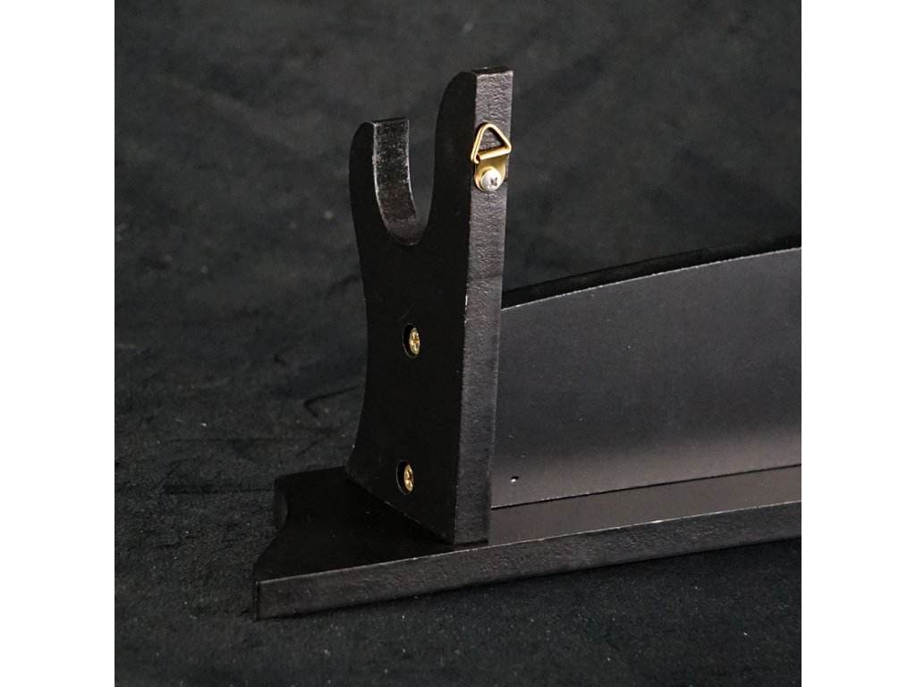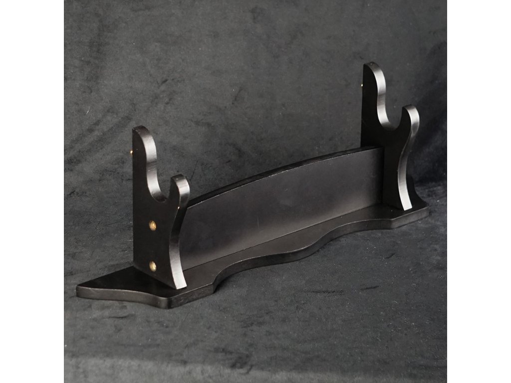 Prezentujte svůj oblíbený meč, katanu, nebo wakizashi stylově - na tomto dvoupatrovém výstavním stojanu. Tento krásný výstavní stojánek je vyroben z dřevěného masivu a jeho finální úprava je matná černá barva. Stojan je možné postavit na stůl a nebo pověsit na zeď. Spojovací prvky jsou ze železa a mosazi.