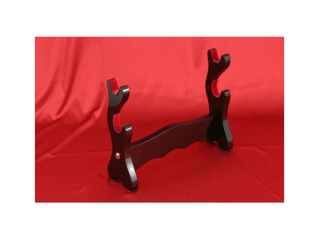Prezentujte svůj oblíbený meč, katanu, nebo wakizashi stylově - na tomto dvoupatrovém výstavním stojanu. Tento krásný výstavní stojánek je vyroben z dřevěného masivu a jeho finální úprava je černý lesk. Povrch je lakovaný - v místech, kde se dotýká se sayou (pouzdrem) a čepelí je polstrován červeným filcem, aby nedocházelo k odření. Spojovací prvky jsou ze železa a mosazi.