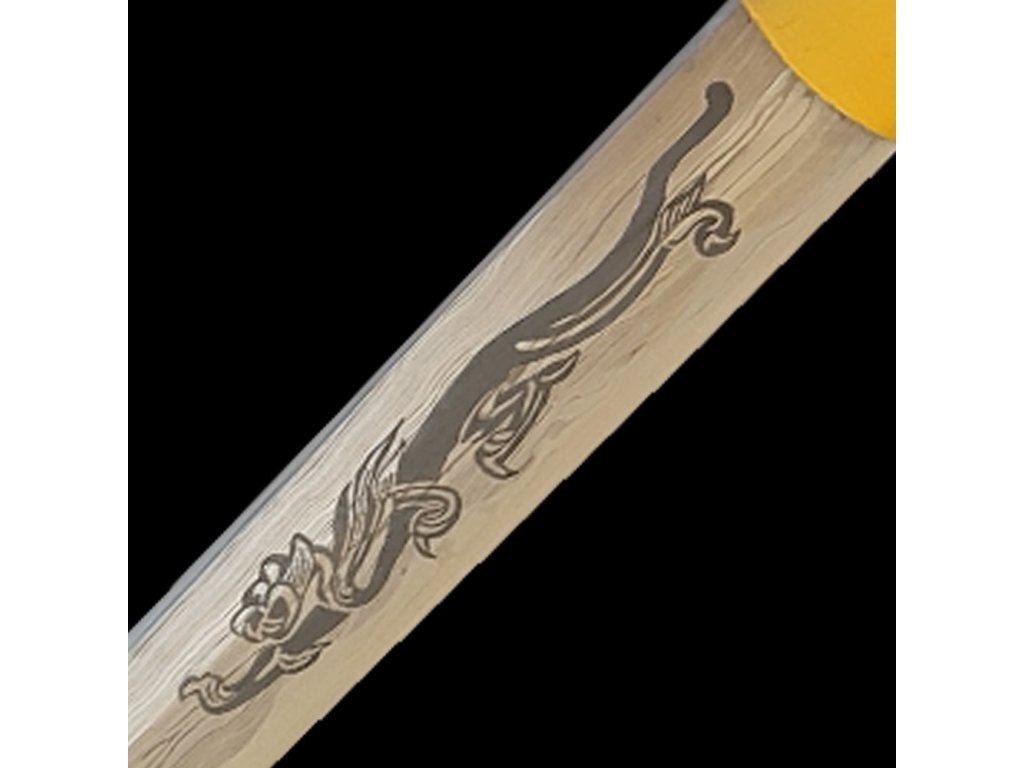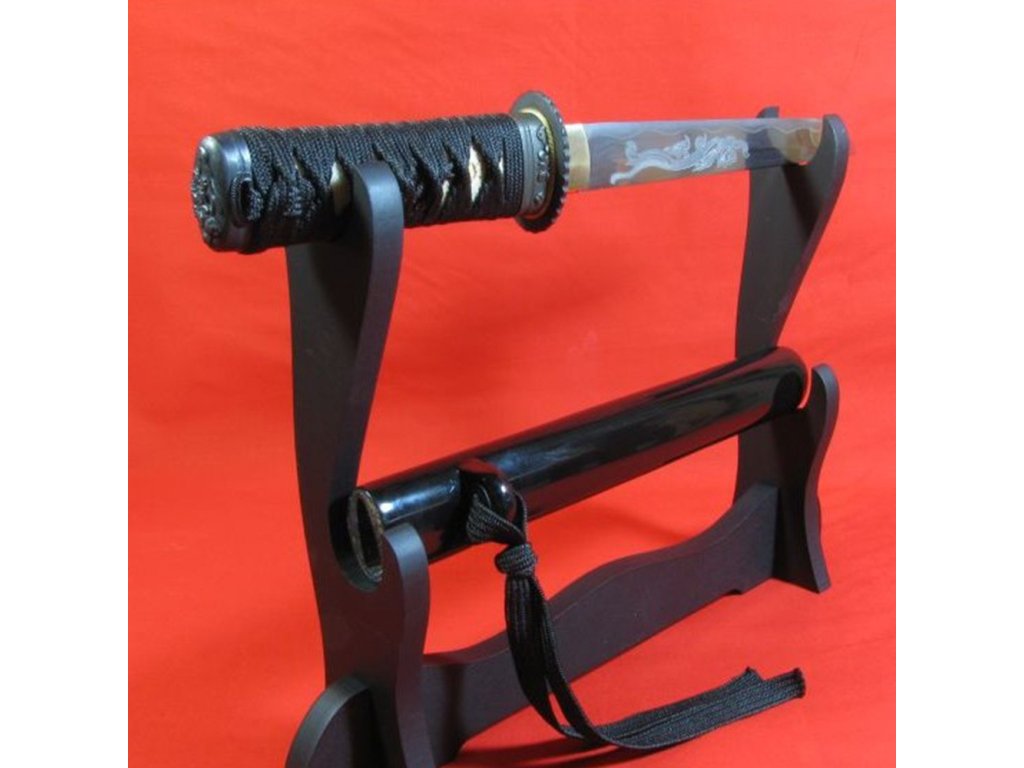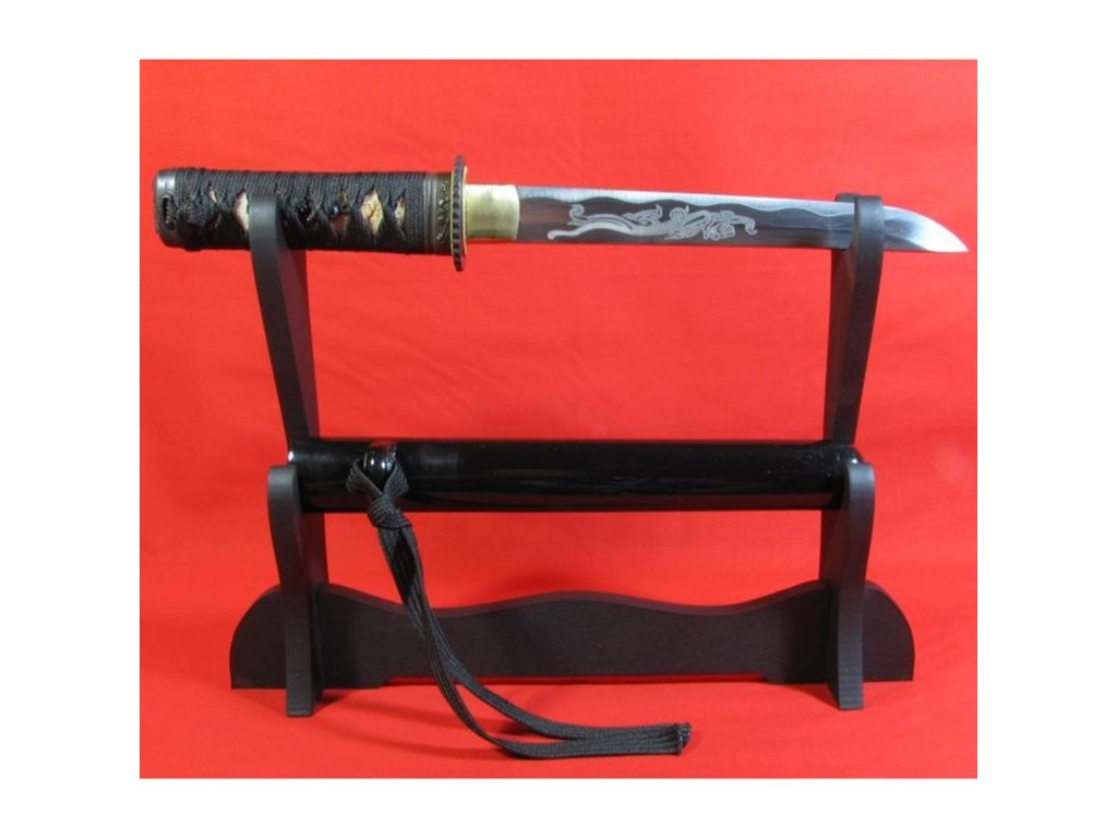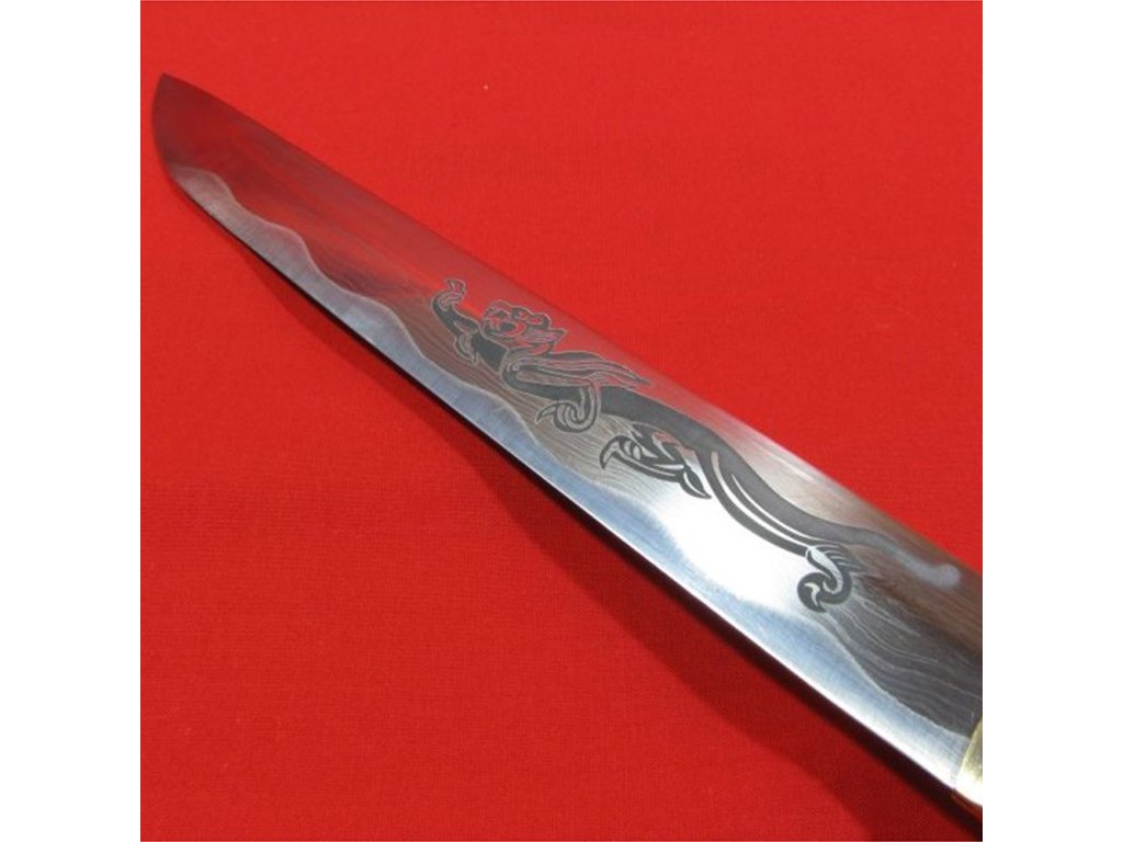Kovaný japonský nůž TANTO s leštěnou imitací kalení (hamonu). Ostrý (broušený) nůž TANTO najde své uplatnění jako dekorace, ale i k aktivnímu nácviku bojového umění. Nůž tanto není zcela vhodný k sekání tvrdších matreriálů. Ocel není parciálně zakalena (hamon je pouze leštěný) a proto má nízký stupeň tvrdosti. Sekání tvrdých materiálů by zanechalo stopy na ostří nože. Atraktivní a ostrá čepel zdobená pískovaným obrázkem draka, pěkná kresba překládané (damaškové oceli), černá lesklá saya plus tsuka (rukojeť), která je potažena pravou rejnočí kůží, to vše dělá toto tanto zajímavým. Stojánek není součástí tohoto tanta. Tanto je uložena v černém plátěném vaku. Tanto je vždy před odesláním pečlivě kontrolováno a zabaleno, aby Vám bylo dručeno k vaší naprosté spokojenosti. Firma Dellinger se zříká jakékoliv odpovědnosti za zranění a poškození vzniklá při použití. Schraňujte tanto mimo dosah dětí ! Jakákoliv manipulace se samurajským nožem je na vaší vlastní odpovědnost. Nezapomeňte, že máte ve svých rukou smrtelnou zbraň !