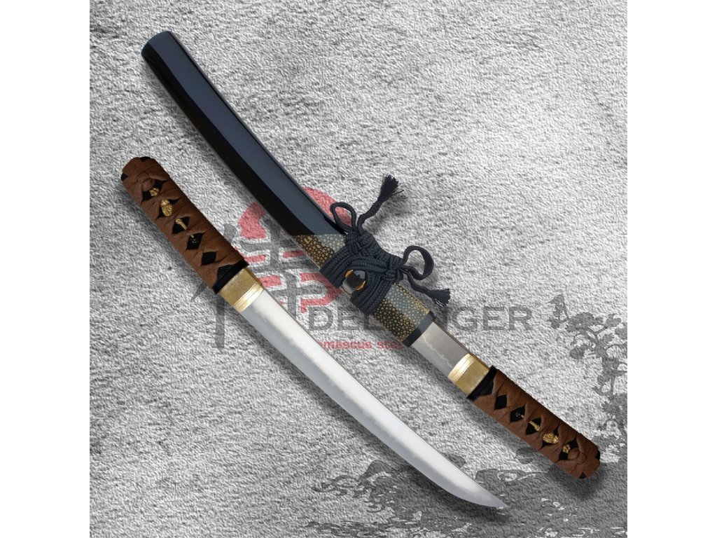 ✅ Tsuka: (rukojeť) dřevěné jádro, potažena pravou rejnočí kůží (Samegawa), hnědá semišová omotávka Ito. Čepel zajištěna 1 kolíkem "mekugi", Menuki (ornament) z každé strany Tsuky