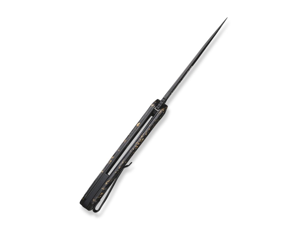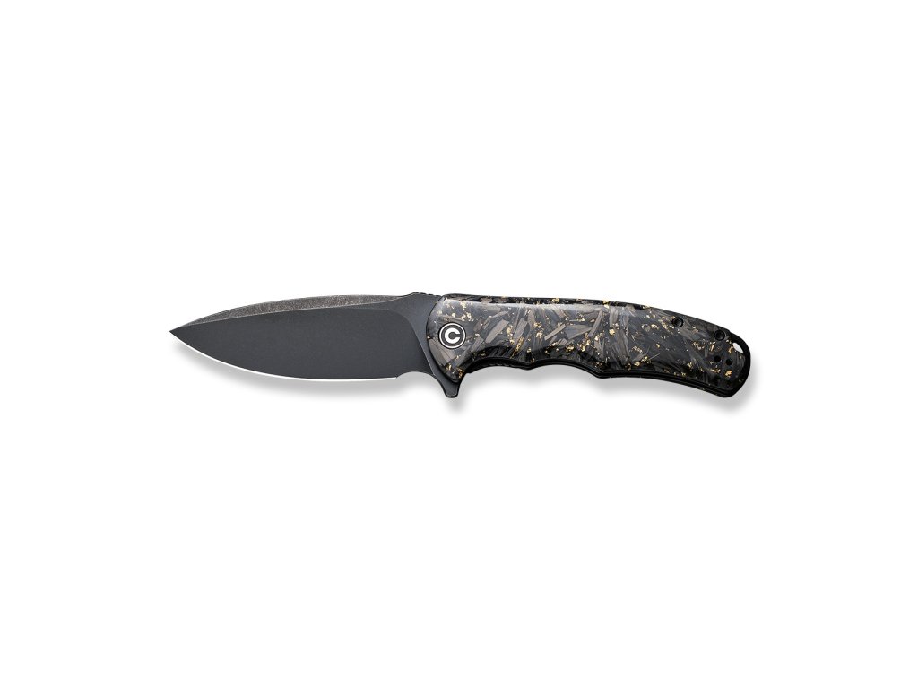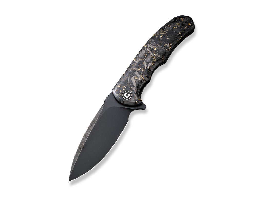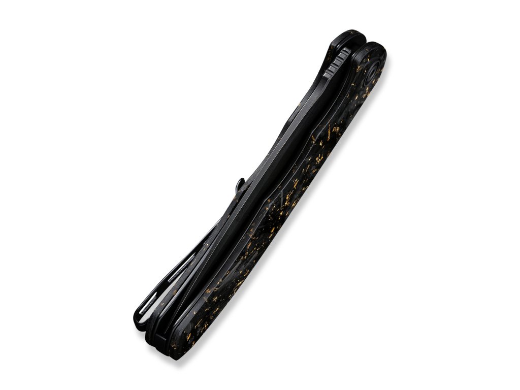 Rukojeť je z drcených uhlíkových vláken a zlatými plátky v pryskyřici na celonerezových příložkách s oboustranným hlubokým kapesním klipem tip-up. Je ergonomický, rychlý a funkční - navržený tak, aby oslovil masy, a to se podle nás CIVIVI rozhodně povedlo.
