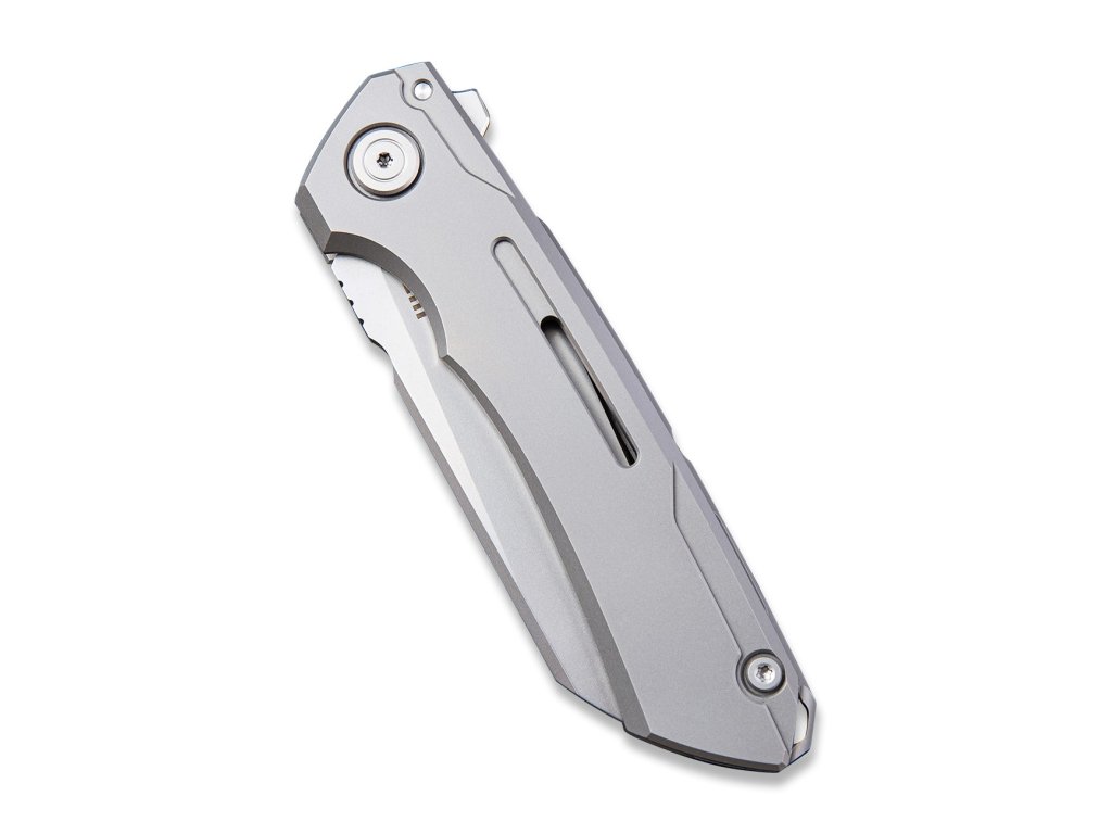 nůž WEKNIFE Mini Buster - Silver je vynikající zavírací EDC nůž přizpůsoben i na těžší práci. Čepel o délce 8,71 cm z exkluzivní nerezové oceli CPM 20CV dosahuje vysokou tvrdost okolo 60 HRC. Vysoká houževnatost a odolnost vůči opotřebení je samozřejmostí. Čepel typu „Sheepsfoot“ má povrchovou úpravu Polished Bead Blast. Střenka rukojeti je z materiálu 6AL4V Titanium. Jednoduché a rychlé otevírání nože pomocí flippru (ploutve).